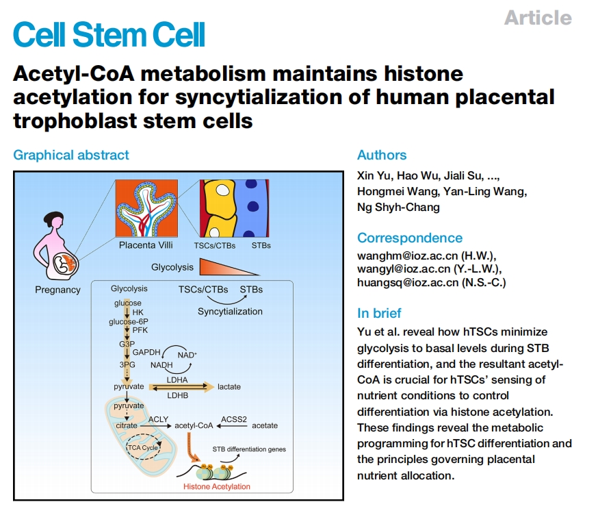 2024年7月30日,中國科學(xué)院動(dòng)物研究所在國際學(xué)術(shù)期刊Cell Stem Cell發(fā)表一項重要研究成果,題為:Acetyl-CoA metabolism maintains histone acetylation for syncytialization of human placental trophoblast stem cells。該研究通過(guò)表觀(guān)組學(xué)、轉錄組和非靶向代謝組學(xué)分析研究了人胎盤(pán)中原發(fā)性CTBs和hTSCs向STBs分化過(guò)程中葡萄糖相關(guān)的代謝組學(xué)特征,并揭示了CTBs和hTSCs從高糖酵解到STBs基礎糖酵解水平的轉變。