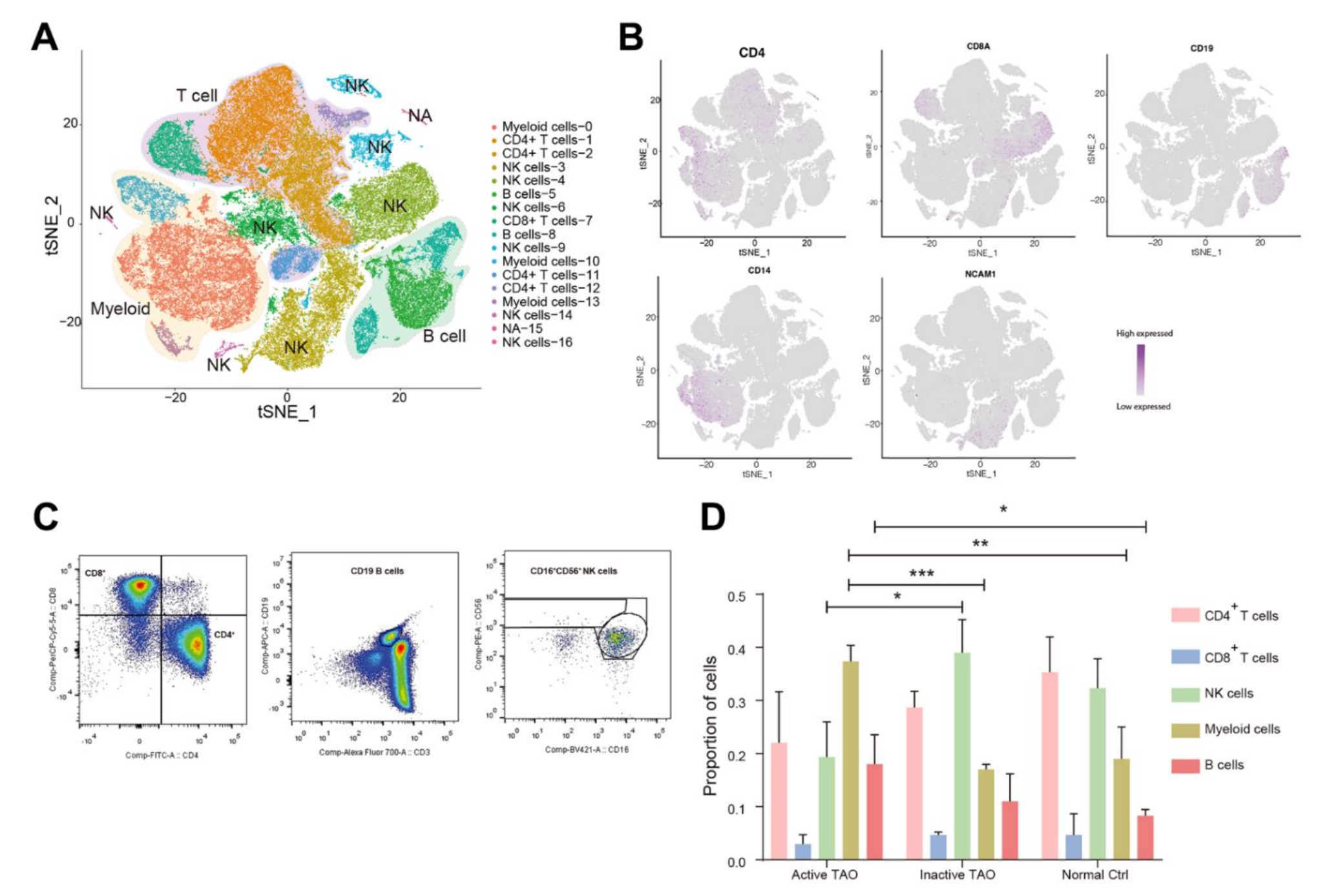 該研究使用10x Genomics Chromium平臺對總共9個(gè)樣本進(jìn)行了scRNA-seq。經(jīng)過(guò)初步質(zhì)量控制后,總共獲得了93,007個(gè)PBMC用于后續分析,其中包括來(lái)自活性TAO的23,051個(gè)細胞、來(lái)自非活性TAO的34797個(gè)細胞和來(lái)自正常對照 (NC) 的35,159個(gè)細胞?;趫D的聚類(lèi)分析確定了17個(gè)不同的聚類(lèi)。在手動(dòng)確認細胞類(lèi)型注釋后,該研究成功將簇分為五種主要的PBMC細胞類(lèi)型。其中包括各種CD4+ T細胞群 (CD4+)、NK (CD56+)、CD8+T細胞 (CD8A+)、B細胞 (CD19+) 和骨髓細胞 (CD11b+)(圖1A,1B)。通過(guò)流式細胞術(shù)分析驗證了scRNA-seq鑒定的這五種細胞類(lèi)型的存在(圖1C)。值得注意的是,17個(gè)細胞簇中的12個(gè) (70.6%) 包含來(lái)自多個(gè)單獨樣本的至少100個(gè)細胞,每個(gè)簇內平均有9個(gè)單獨樣本。
