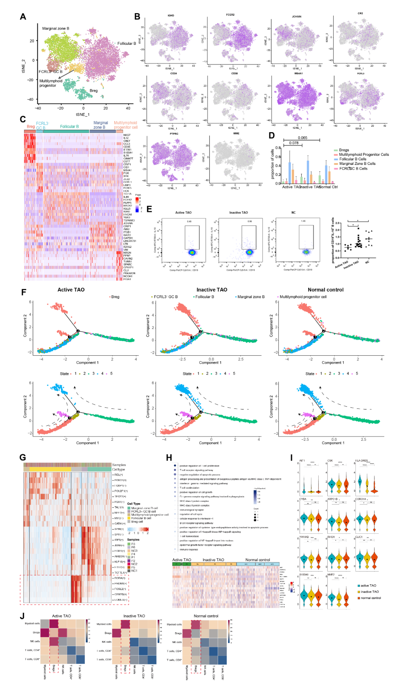 隨后檢查了疾病不同階段每個(gè)樣本中的B細胞組成。雖然三組的Bregs相對比例沒(méi)有顯著(zhù)差異,但與非活動(dòng)TAO組和正常對照組相比,活動(dòng)TAO中的Bregs比例較低(p=0.078和p=0.065)(圖2D)。盡管觀(guān)察到的差異未達到統計顯著(zhù)性,但這一結果表明了數據的潛在趨勢。為了驗證這些結果,該研究進(jìn)行了流式細胞術(shù)分析,并使用CD19+IL-10+作為識別Bregs細胞群的標記。IL-10由于其抑制促炎癥反應的能力而被廣泛認為是Breg的標志。該分析證實(shí),與非活動(dòng)TAO和NC組相比,活動(dòng)TAO中的Breg頻率降低(圖2E)。
