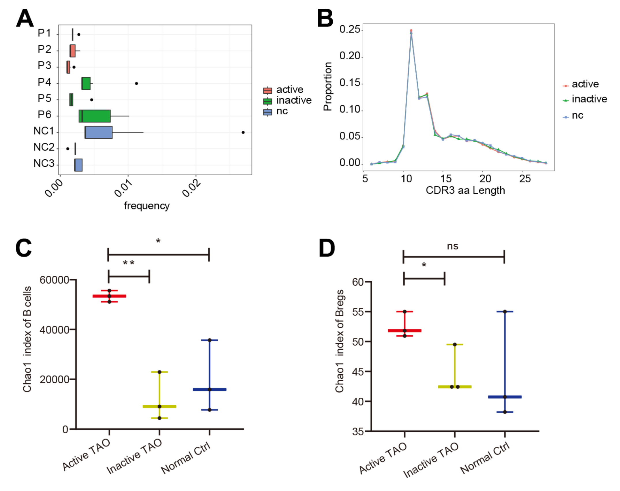 為了全面分析B細胞群中的基因表達和BCR多樣性,該研究對scRNA-seq分析中使用的PBMC樣本進(jìn)行了scBCR-seq。在活性TAO中,前10個(gè)克隆型的比例(0.17%)與非活性組(0.37%,p=0.010)和NC組(0.41%,p=9.31E-05)(圖3A)。然而,對互補決定區3 (CDR3) 長(cháng)度的分析沒(méi)有顯示任何明顯的變化(圖3B)。當檢查CDR3的多樣性時(shí),通過(guò)Chao1指數量化,與NC組 (p=0.016) 和非活動(dòng)TAO組 (p=0.002) (圖3C)。Breg細胞中也出現了類(lèi)似的趨勢(圖 3D),與NC組相比顯著(zhù)增加(p=0.011),但活性TAO之間沒(méi)有統計學(xué)顯著(zhù)差異組和NC組 (p=0.213)。這些發(fā)現表明,雖然活性TAO中前10個(gè)克隆型的頻率降低,但在這種情況下CDR3序列的多樣性增加,這可能對免疫反應的調節有影響,并有助于活性TAO的發(fā)病機制。