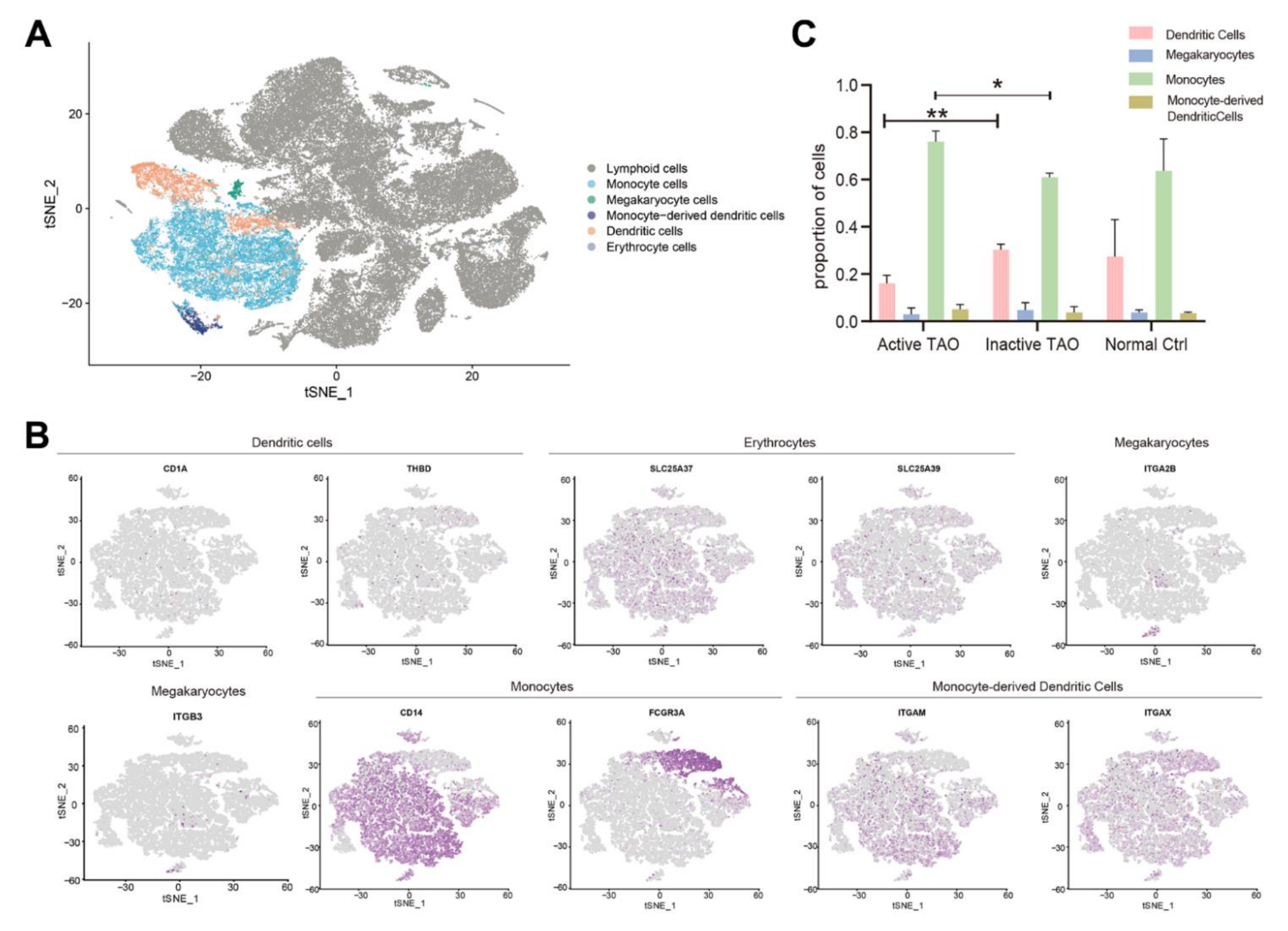 為了評估骨髓細胞在TAO中的參與情況,該研究鑒定了骨髓細胞的主要亞型,并檢查了它們在活性TAO中的配置。分析顯示了五種不同的骨髓細胞群,即單核細胞、巨核細胞、樹(shù)突狀細胞 (DC)、單核細胞衍生的DC和紅細胞(圖4A )。這些細胞類(lèi)型的鑒定基于差異基因表達和對已建立的譜系標記的檢查(圖4B)?;钚訲AO 和非活性TAO之間的比較揭示了單核細胞和DC比例的顯著(zhù)差異。與非活動(dòng)TAO組相比,活動(dòng)TAO患者的單核細胞比例顯著(zhù)較高 (p=0.006),而活動(dòng)TAO中DC的比例顯著(zhù)較低 (p= 0.003) (圖4C)。這些發(fā)現表明,單核細胞水平增加和DC數量減少可能是TAO患者活動(dòng)性疾病狀態(tài)的特征。