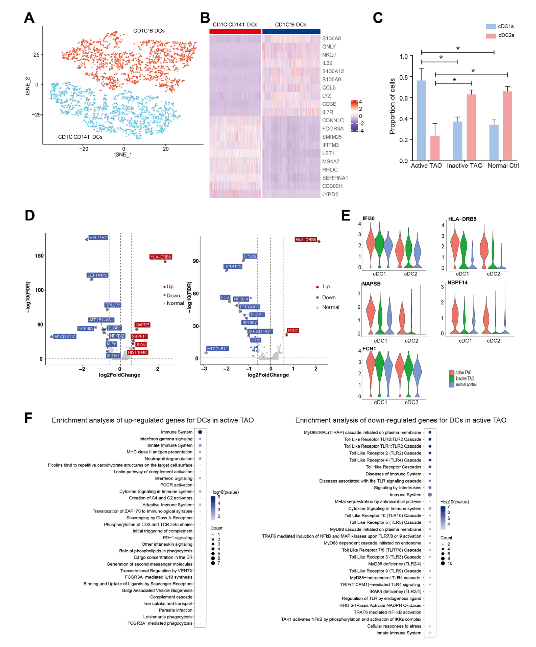 DC被細分為三個(gè)不同的子簇。Cluster 0被指定為cDC1s,其特征是高表達CDKN1C、FCGR3A、SMIM25、IFITM3、LST1和MS4A7,以及CD1C和 CD141的低表達。簇1和簇2被鑒定為cDC2,其炎癥基因的表達水平升高,例如 CD14、S100A8、GNLY、NKG7 、IL32和S100A12(圖5A、5B)。cDC1s的比例在活性TAO中顯著(zhù)較高,而cDC2s在非活性TAO和NC中更為普遍(圖 5C)。鑒于cDC1和cDC2在免疫調節中發(fā)揮不同的作用- cDC1專(zhuān)門(mén)誘導Th2反應,而cDC2亞群表現出更強大的誘導Th1反應的能力[42],該研究進(jìn)一步檢查了它們的基因表達譜。