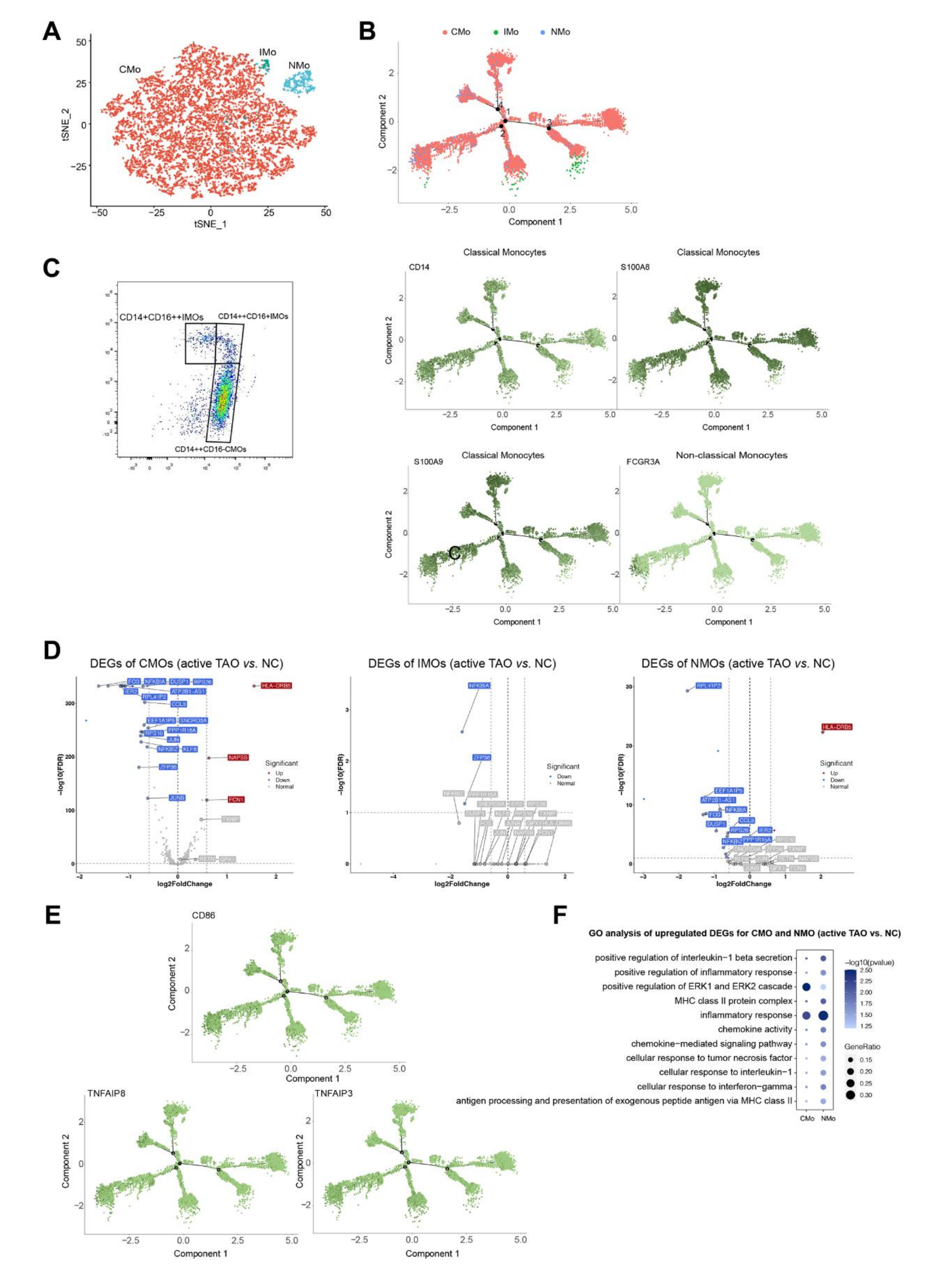 作者的聚類(lèi)分析成功地從總共 12,959 個(gè)單核細胞中識別出三個(gè)不同的亞群。第一個(gè)簇的特征是經(jīng)典單核細胞 (CMO),其表現出高表達水平的CD14、S100A8 和 S100A9。第二個(gè)簇被鑒定為非經(jīng)典單核細胞 (NMO),其特征是高表達FCGR3A(也稱(chēng)為 CD16)。第三簇被識別為中間單核細胞 (IMO),CD14和FCGR3A均高表達(圖6A、6B)。為了驗證這些單核細胞亞簇,進(jìn)行了流式細胞術(shù)分析,確認 CMO為CD14++CD16-,NMO為CD14+CD16++,IMO為CD14++CD16+(圖6C)。軌跡推斷分析表明,單核細胞遵循從CMO開(kāi)始并向NMO和IMO狀態(tài)分支的發(fā)育軌跡(圖6B)。這些對TAO期間單核細胞發(fā)育狀態(tài)變化的觀(guān)察表明它們在該疾病中的潛在作用。