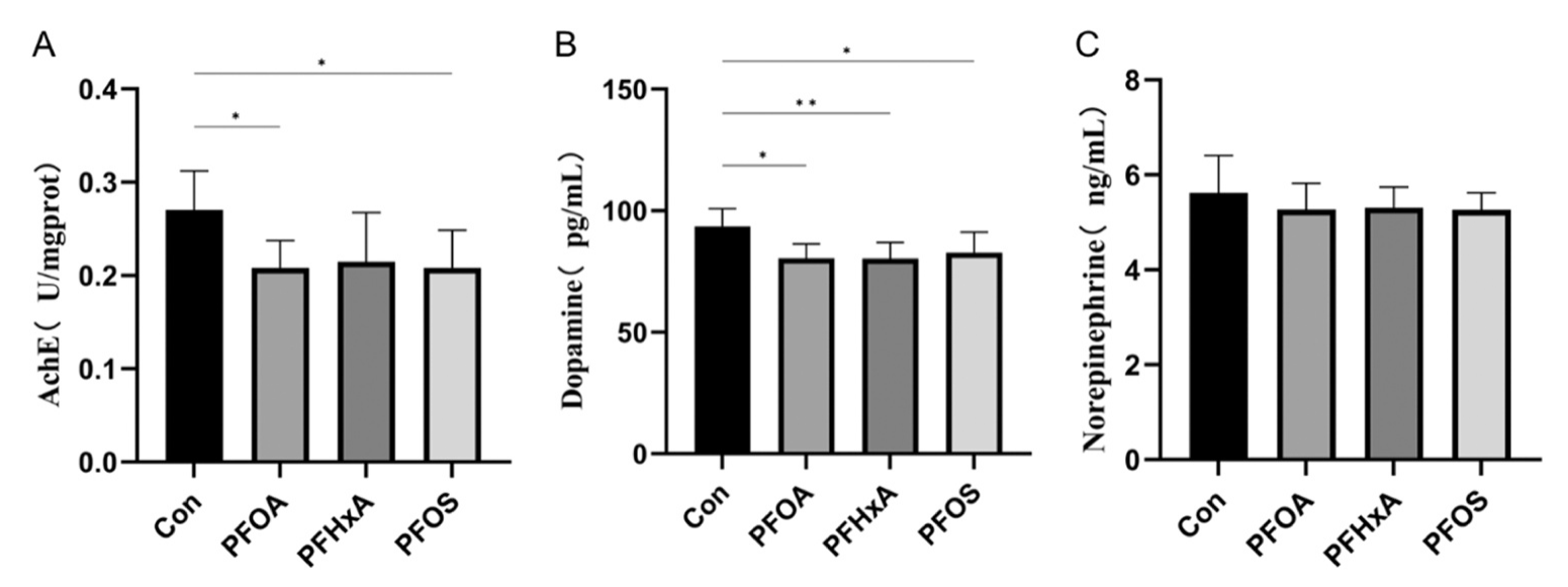 研究了PFAS對鯽魚(yú)腦組織乙酰膽堿酯酶和神經(jīng)遞質(zhì)活性的影響。與Con組相比,PFOA和PFOS組腦內乙酰膽堿酯酶活性顯著(zhù)降低。此外,PFOA、PFHxA和PFOS組多巴胺(DA)水平顯著(zhù)降低(圖2B)。然而,去甲腎上腺素(NE)水平在實(shí)驗魚(yú)組之間沒(méi)有顯著(zhù)變化(圖2C)。這些結果表明,PFAS暴露抑制了魚(yú)腦中的AChE和神經(jīng)遞質(zhì)水平,并影響了整體腦功能。