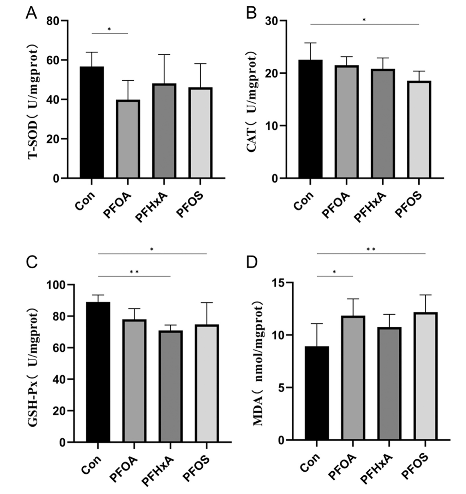 處理條件:對照組(Con)、全氟辛烷磺酸(PFOS)、全氟辛酸(PFOA)、十一氟己酸(PFHxA)組指標檢測:過(guò)氧化氫酶(CAT)、總超氧化物歧化酶(T-SOD)、谷胱甘肽過(guò)氧化物酶(GSH-Px)、丙二醛(MDA)、乙酰膽堿酯酶(AChE)
