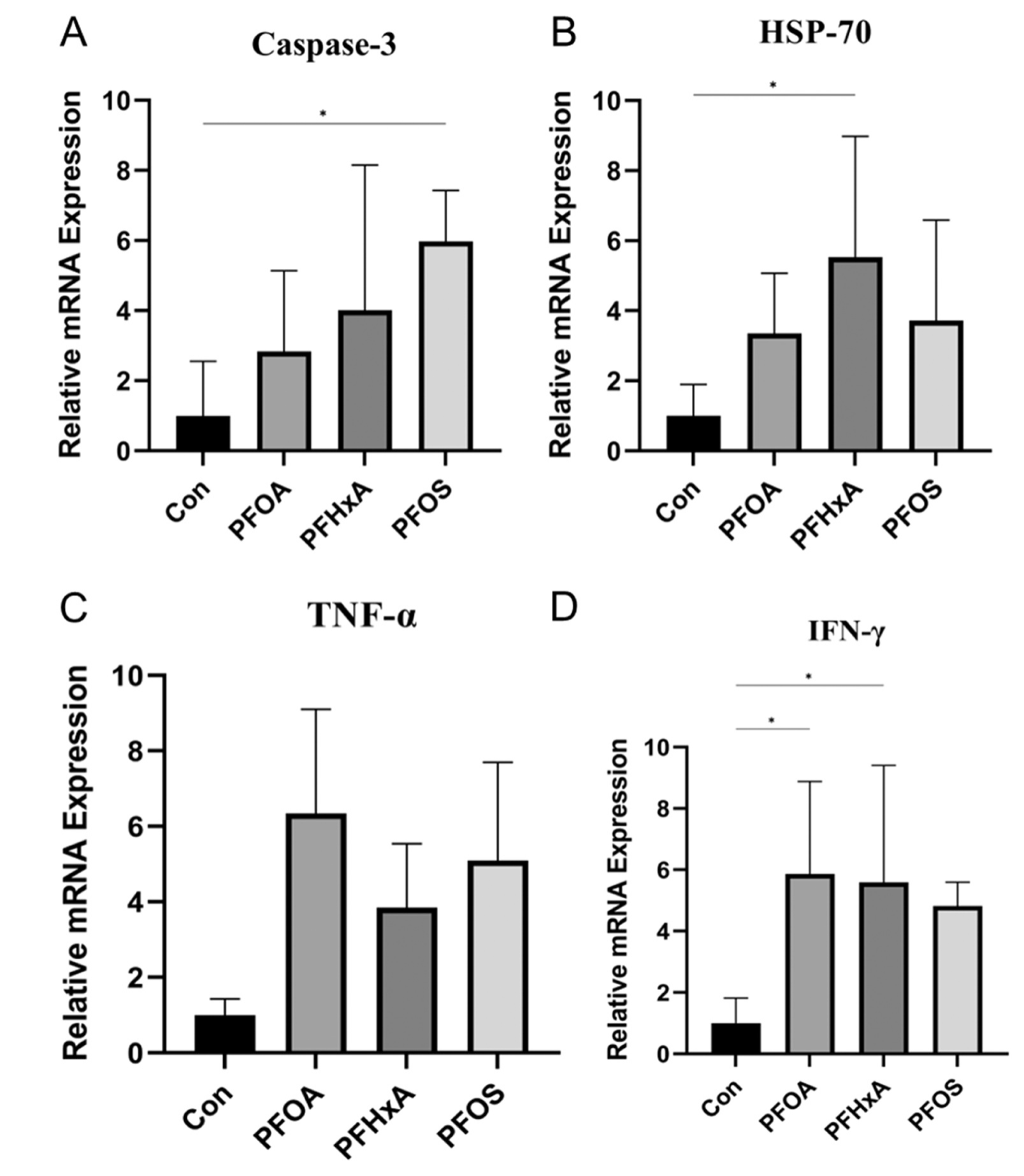 PFOS組與Con組相比,應激相關(guān)基因caspase-3的表達顯著(zhù)升高(圖5A)。同樣,在PFHxA組中,HSP-70的表達顯著(zhù)增加(圖5B)。此外,促炎細胞因子INF-γ在PFOA和PFHxA組中的表達水平顯著(zhù)升高(圖5D),而TNF-α的表達在兩組間無(wú)顯著(zhù)差異(圖5C)。