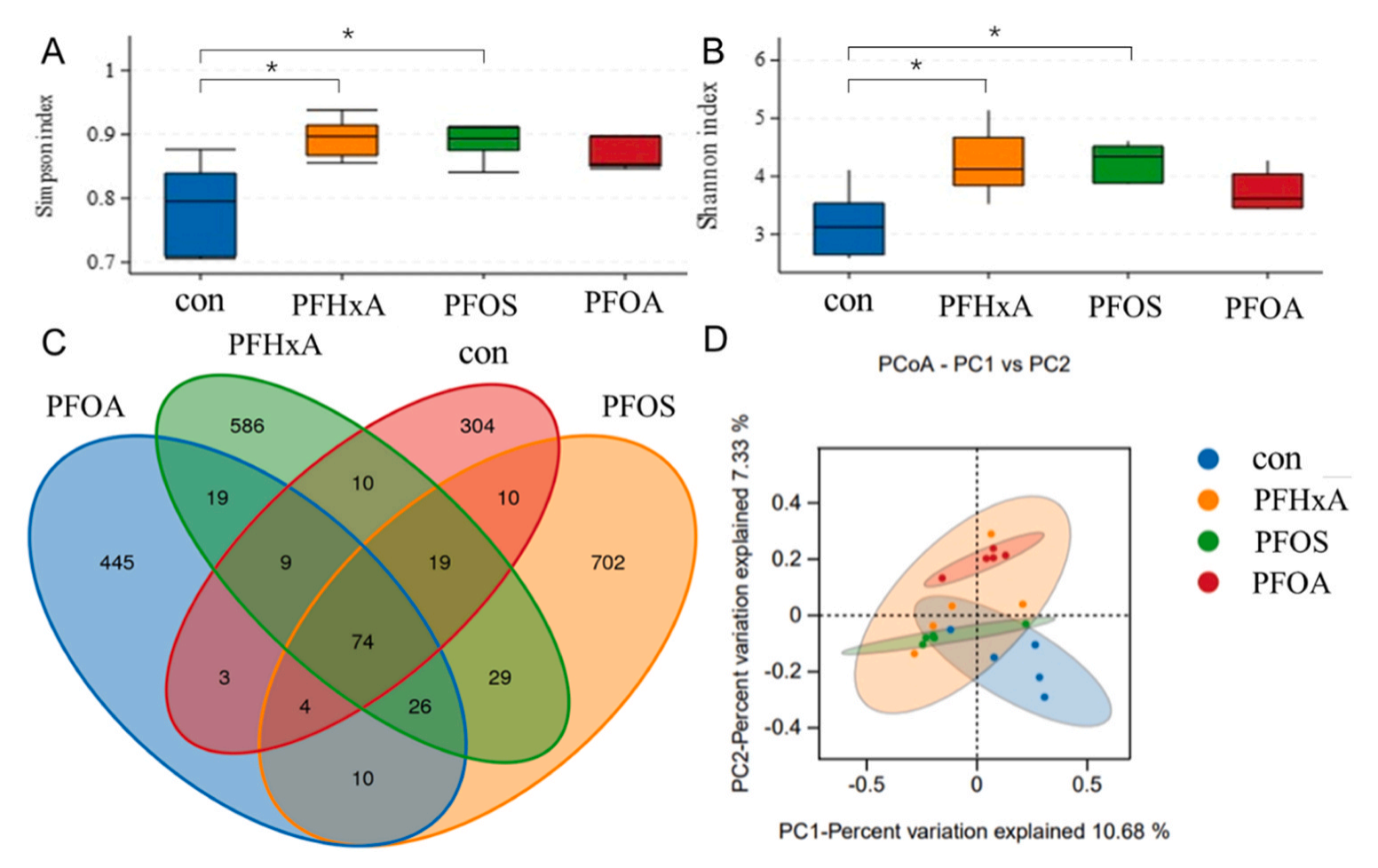 與Con組相比,PFHxA和PFOS組細菌群落的Simpson和Shannon指數明顯高于Con組(圖6A和B),表明細菌物種多樣性有所增加?;贠TU的venn圖分析(圖6C),四組之間重疊OTUs數量相對較少(不超過(guò)100個(gè)),各組特有的OTUs相對較多(均超過(guò)300個(gè))。圖6D清楚地顯示了Con組與其他三組在微生物群方面的顯著(zhù)差異,表明PFAS暴露引起了鯽魚(yú)腸道微生物群組成的變化。