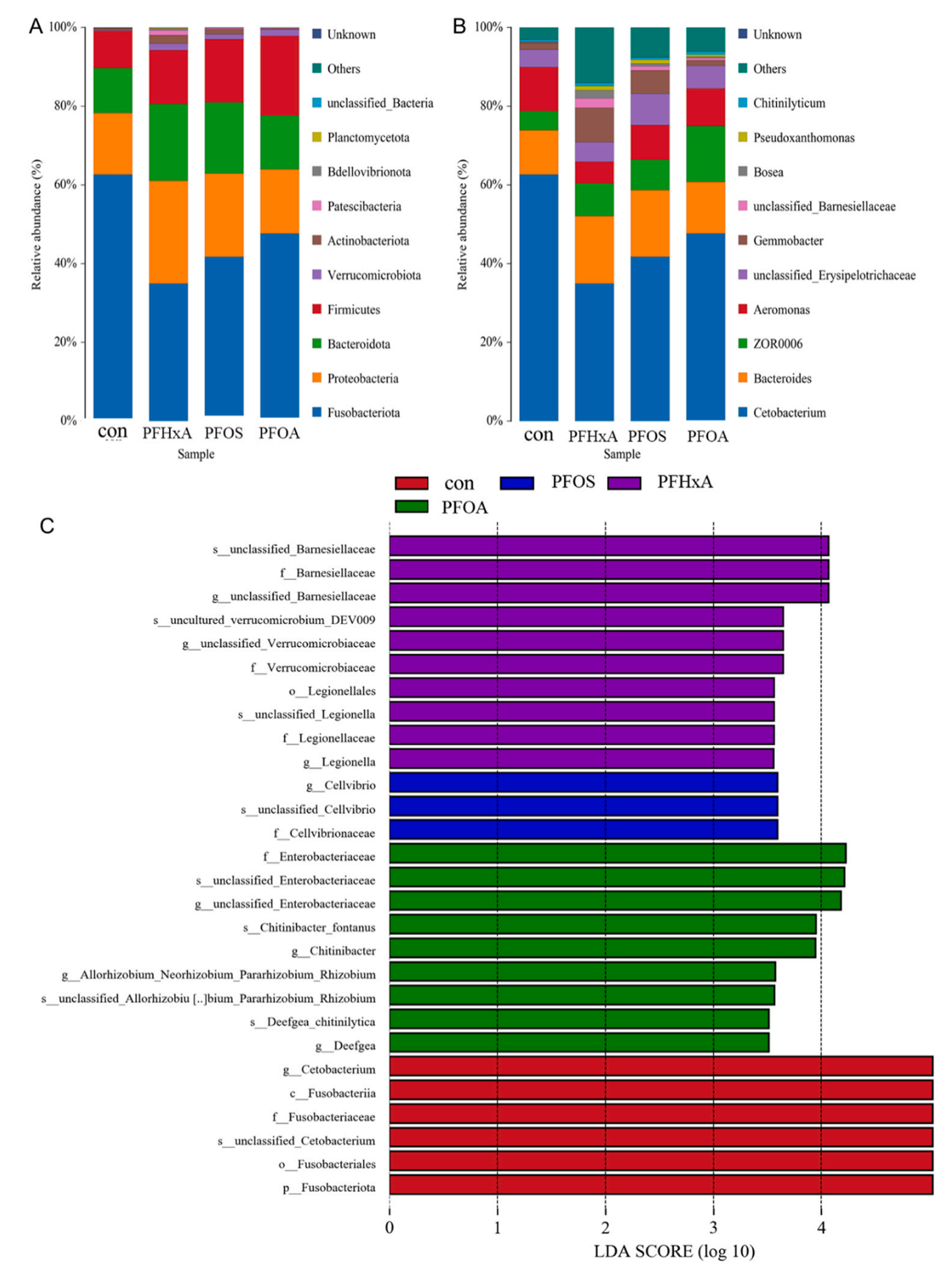 在門(mén)水平上,與Con組相比,PFHxA、PFOS和PFOA組梭桿菌門(mén)的豐度減少,而變形菌門(mén)、擬桿菌門(mén)、厚壁菌門(mén)、Verrucomicrobiota和放線(xiàn)菌門(mén)的豐度增加(圖7A)。在屬水平上,與Con組相比,PFHxA、PFOA和PFOA組中Cetobacterium的豐度降低,Bacteroides、unclassified_Erysipelotrichaceae和Gemmobacter的豐度增加(圖7B)。采用基于不同處理的LEfSe進(jìn)行線(xiàn)性判別分析(LDA),確定Con組與各PFAS處理組間的種數有統計學(xué)差異。如圖7C所示,PFHxA組Verrucomicrobiaceae、Legionellaceae和Legionella豐度顯著(zhù)增加,PFOS組Cellvibrio豐度顯著(zhù)增加,PFOA組Enterobacteriaceae和Deefgea豐度顯著(zhù)增加。這些結果表明,PFAS暴露改變了鯽魚(yú)腸道菌群組成,增加了潛在致病菌的數量。