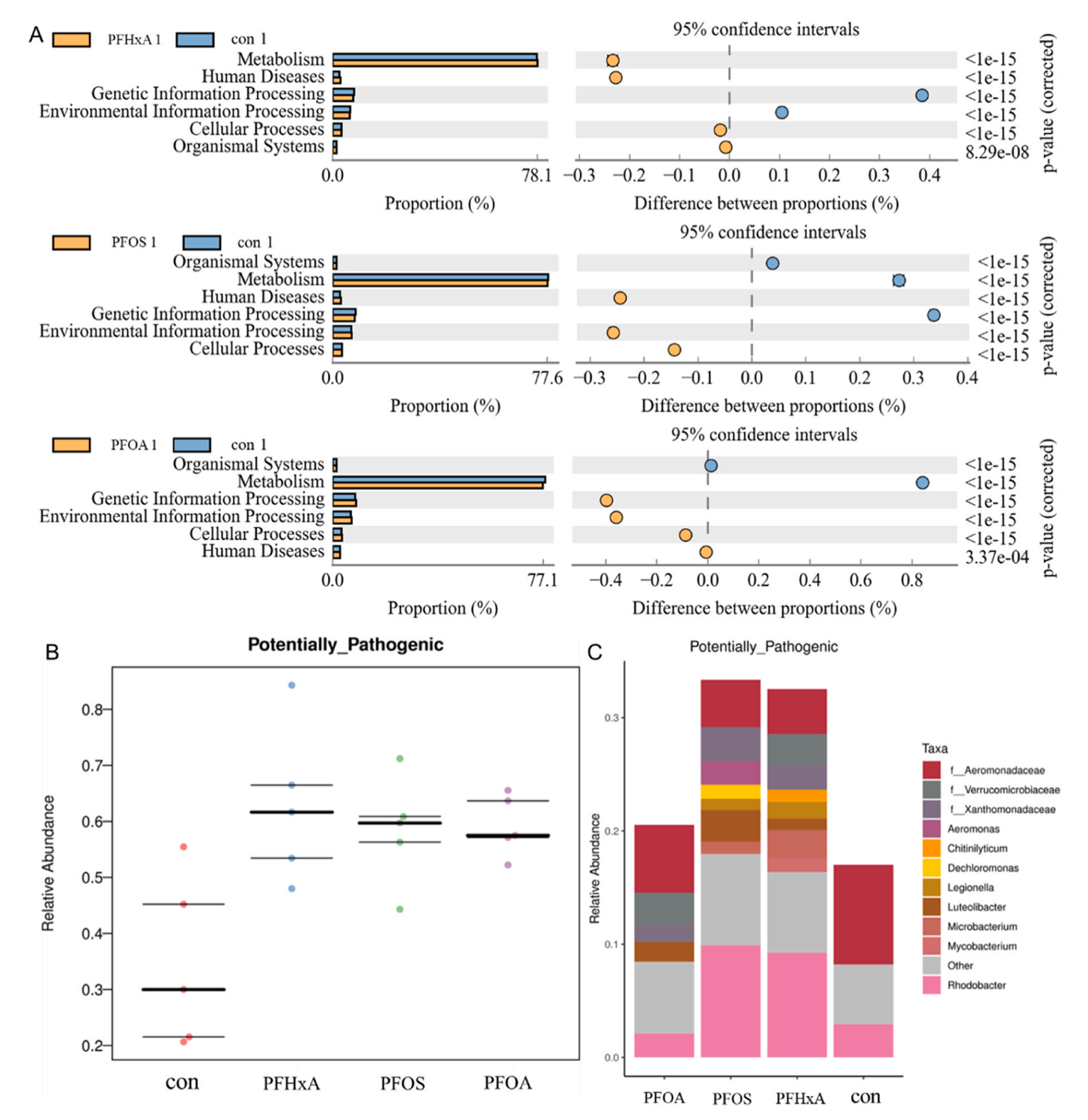 根據PICRUSt2,根據特征序列預測整個(gè)群落的通路變化,并進(jìn)行功能基因差異分析。與Con組相比,所有三個(gè)PFAS治療組都顯著(zhù)改善了人類(lèi)疾病中涉及的細胞過(guò)程和信號通路(圖8A)。利用BugBase對表型分類(lèi)進(jìn)行預測。與Con組相比,每個(gè)PFAS治療組顯著(zhù)增加了微生物群的潛在致病性(圖8B)。在屬水平上,與Con組相比,各PFAS處理組增加了Luteolibacter的相對豐度,PFOS和PFHxA組增加了Rhodobacter和Legionella的相對豐度,PFOS組增加了decchloromonas和Aeromonas的相對豐度(圖8C)。這些結果表明,PFAS可能導致鯽魚(yú)腸道菌群的潛在致病性增加。