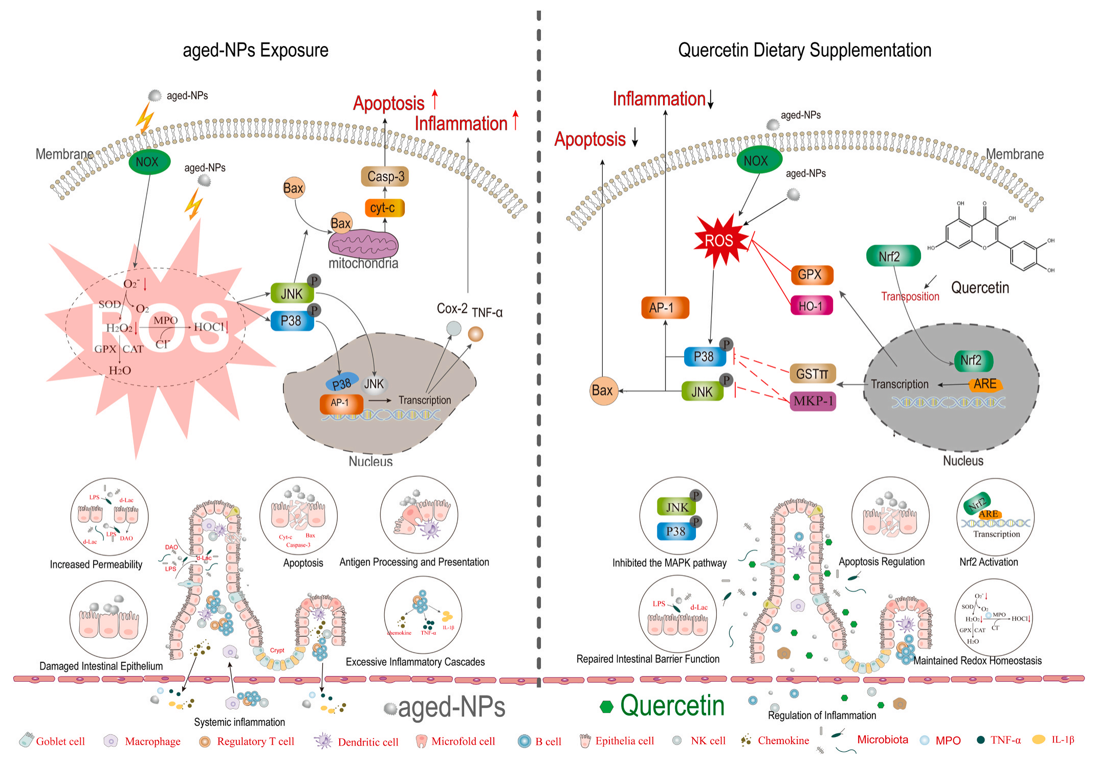 血清肌酐等指標結果顯示,老化NPs刺激顯著(zhù)增加了血清中標記物的水平,表明細胞旁通透性增強,Que減弱了細胞旁通透性,恢復了接近對照的標記水平,這些結果說(shuō)明腸道屏障的破裂主要歸因于腸上皮細胞的丟失和死亡,而不是緊密連接的破壞。磨蝕效應和程序性細胞死亡可能為損傷的主要原因。TUNEL結果顯示,與對照組相比,老化NPs組的熒光標記細胞更多,而老化NPs+Que染色的上皮細胞數量減少,表明Que對上皮細胞凋亡具有保護作用。JNK通路的激活通過(guò)bax-線(xiàn)粒體途徑促進(jìn)細胞凋亡,MAPK信號通路是KEGG富集通路之一,它在細胞凋亡過(guò)程中起著(zhù)至關(guān)重要的作用,p-JNK作為MAPK通路的一個(gè)主要分支,p-JNK在老化NPs組顯著(zhù)增強,此外,衰老的nps也增加了JNK的靶蛋白c-Jun的磷酸化水平,結果表明,老化NPs通過(guò)JNK信號通路激活bax-線(xiàn)粒體凋亡通路,從而誘導細胞凋亡。在老化NPs處理中,DHE染色顯示出較高的紅色熒光密度和明顯的亮點(diǎn),表明ROS水平較高,而在老化NPs+Que中沒(méi)有,添加Que顯著(zhù)降低了老化NPs處理后高過(guò)氧化氫和?O2-的存在,NOX活性測定結果顯示,與對照組相比,老化NPs和老化NPs+Que處理均導致NOX活性增加,且之間無(wú)顯著(zhù)差異,表明Que的主要作用是作為一種自由基清除劑,而不是一種自由基生成的抑制劑。