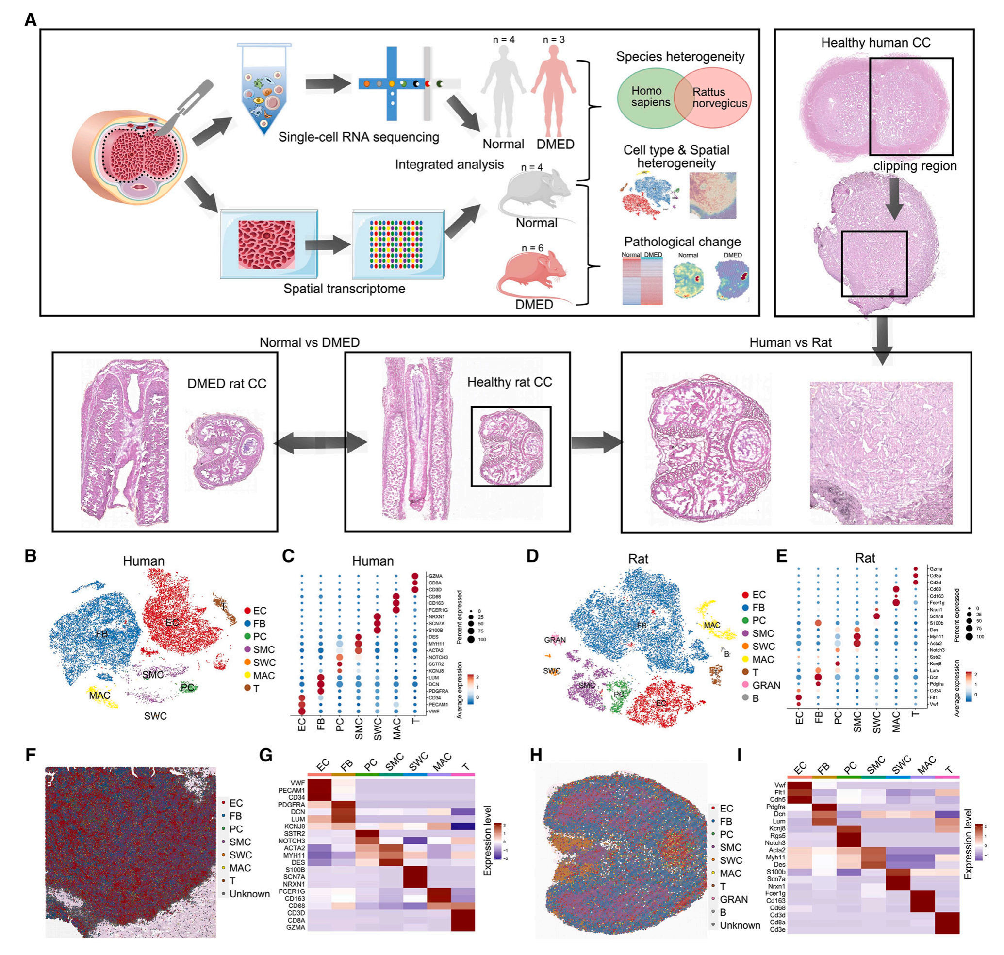 圖1-通過(guò)scRNA-seq和空間轉錄組技術(shù)得到的人類(lèi),以及正常/DMED條件下大鼠的CC細胞全局表達譜
