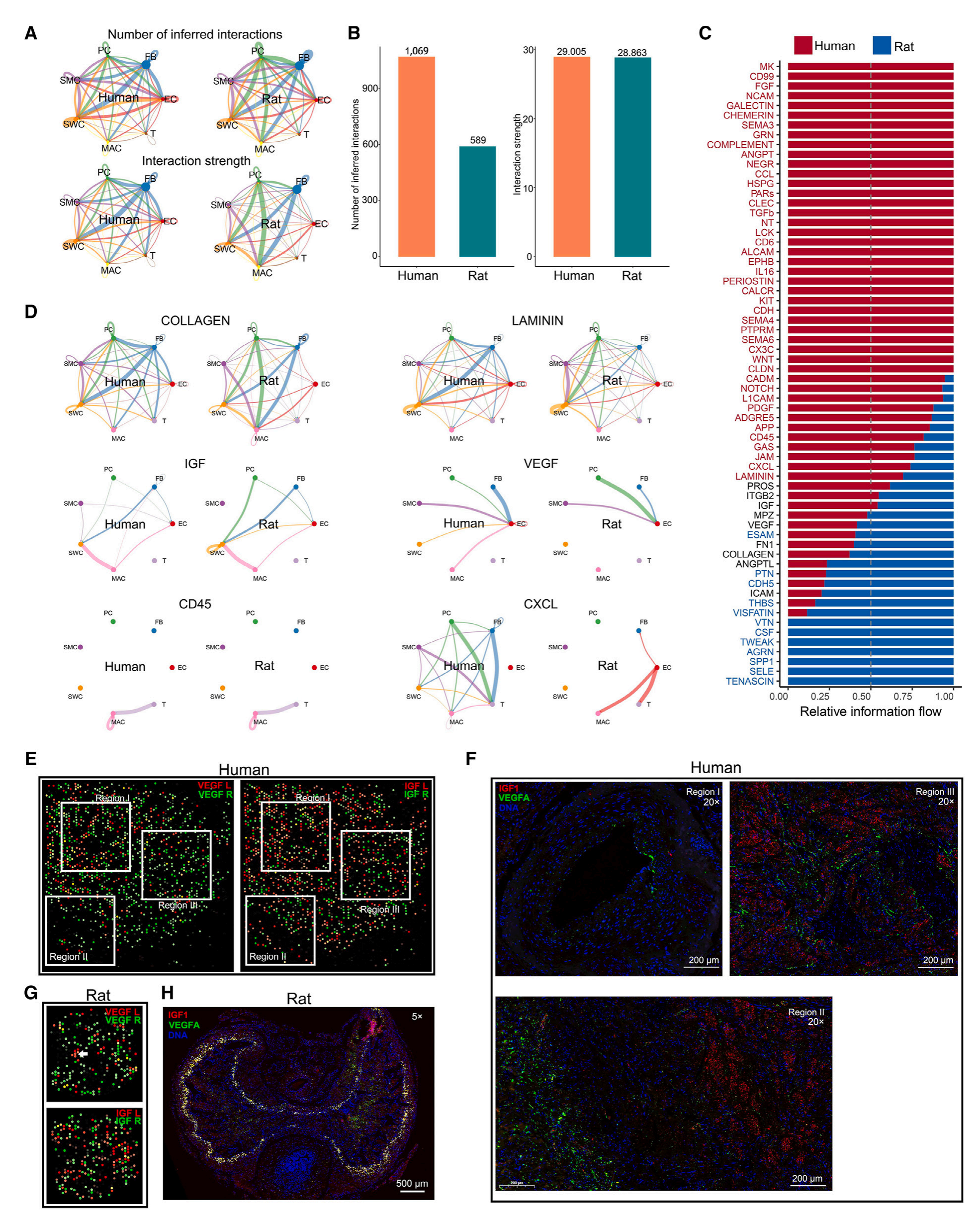 為了研究、比較人類(lèi)和大鼠間CC微環(huán)境的復雜信號網(wǎng)絡(luò ),研究者使用scRNA-seq數據進(jìn)行CellChat分析,發(fā)現大鼠CC中的細胞互作數量雖然小于人類(lèi),但細胞互作強度是相似的?;谶@些互作的表達模式,研究者進(jìn)行簡(jiǎn)單的分類(lèi),發(fā)現雖然胞外基質(zhì)相關(guān)的互作整體強度與細胞類(lèi)型間配體-受體強度相當,但兩者基因組成是有差異的;血管生成相關(guān)的互作整體強度在人類(lèi)和大鼠中沒(méi)有差異,但基因組成存在差異,如大鼠CC微環(huán)境中是主要是VEGFB表達,而人類(lèi)CC微環(huán)境中高表達的是VEGFA和IGF1。