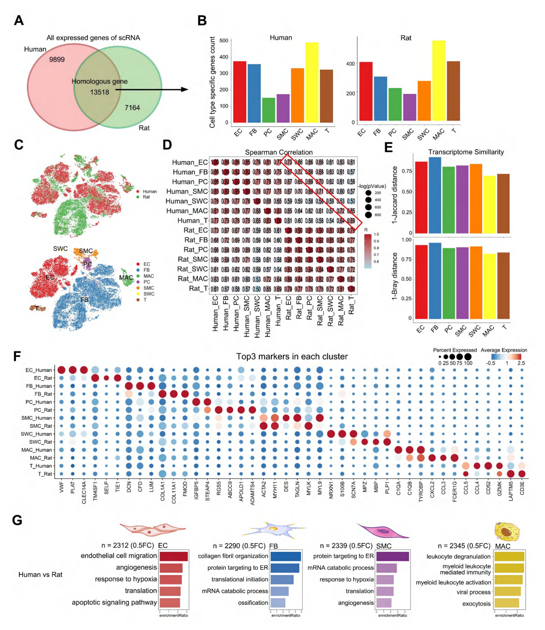 通過(guò)分析空間轉錄組數據中的人—鼠同源基因,研究者找到人類(lèi)和大鼠共有的459個(gè)top SVG,大多數SVG并不是細胞類(lèi)型特異的,其中EC、FB和SMC是表達這些SVG最多的3種類(lèi)型細胞。富集分析結果顯示,基礎生物學(xué)過(guò)程如“translational initiation”、“extracellular structure organization”以及“protein targeting”,在人類(lèi)和大鼠CC組織的空間轉錄組數據中是保守的;人類(lèi)特異SVG主要與炎癥響應有關(guān),而這些SVG的大鼠同源基因主要與代謝過(guò)程有關(guān)。