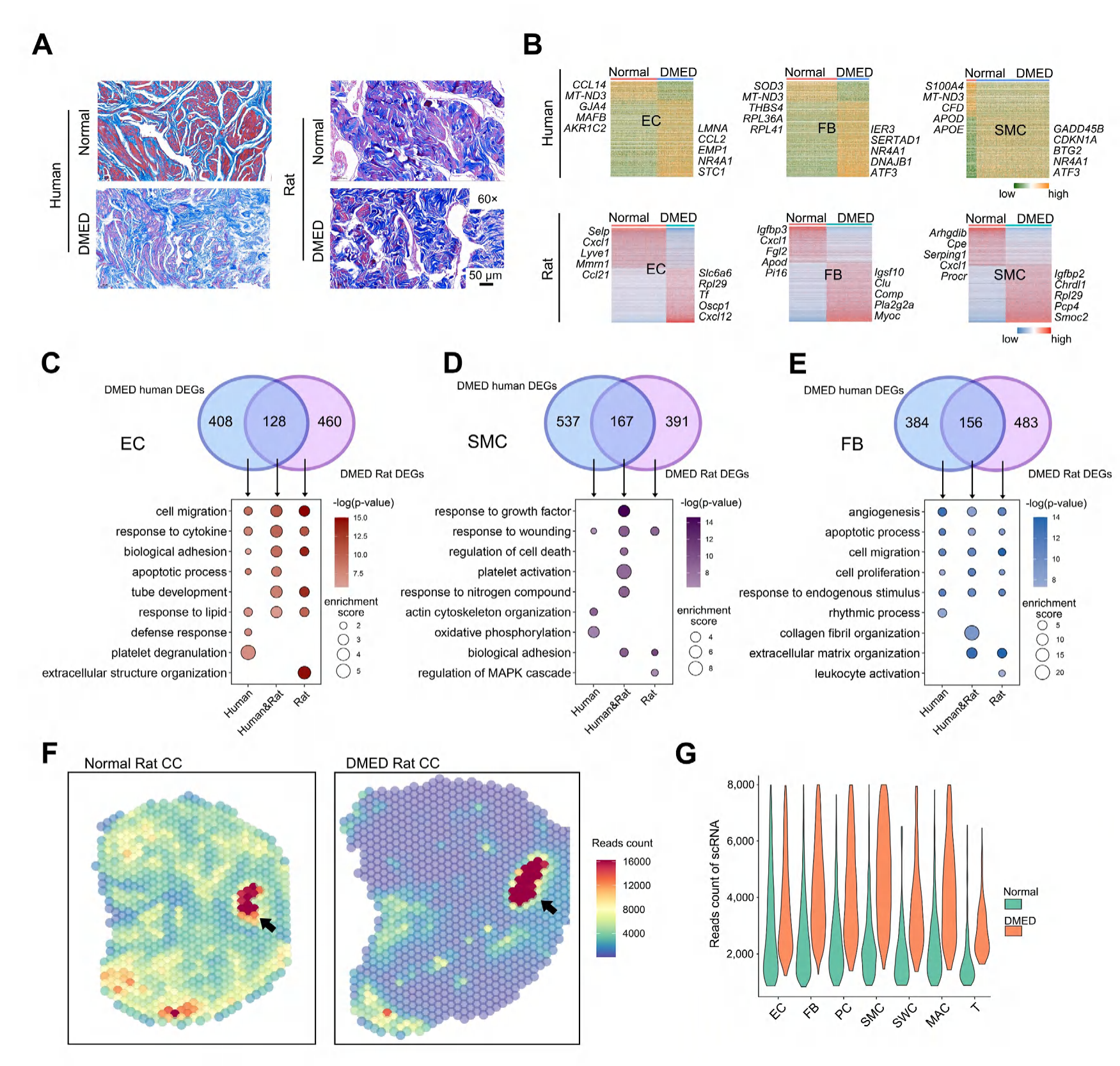 為了更好的認識DMED病理條件下,人類(lèi)和大鼠CC微環(huán)境發(fā)生的變化是否與每種CC細胞類(lèi)型中發(fā)生的分子水平變化相一致,研究者通過(guò)分析scRNA-seq數據,發(fā)現DMED大鼠模型和DMED患者都經(jīng)歷了顯著(zhù)的纖維化以及細胞組分丟失,但兩者間的轉錄組差異顯著(zhù)。富集分析結果顯示,僅DMED大鼠模型富集了“extracellular structure organization”;“actin cytoskeleton or organization”和“oxidative phosphorylation”僅在人類(lèi)DMED患者SMC中發(fā)現,“regulation of MARK cascade”僅在DMED大鼠模型SMC中富集;“rhythmic process”僅在人類(lèi)DMED患者FB中富集,“l(fā)eukocyte activation”僅在DMED大鼠模型FB中富集。