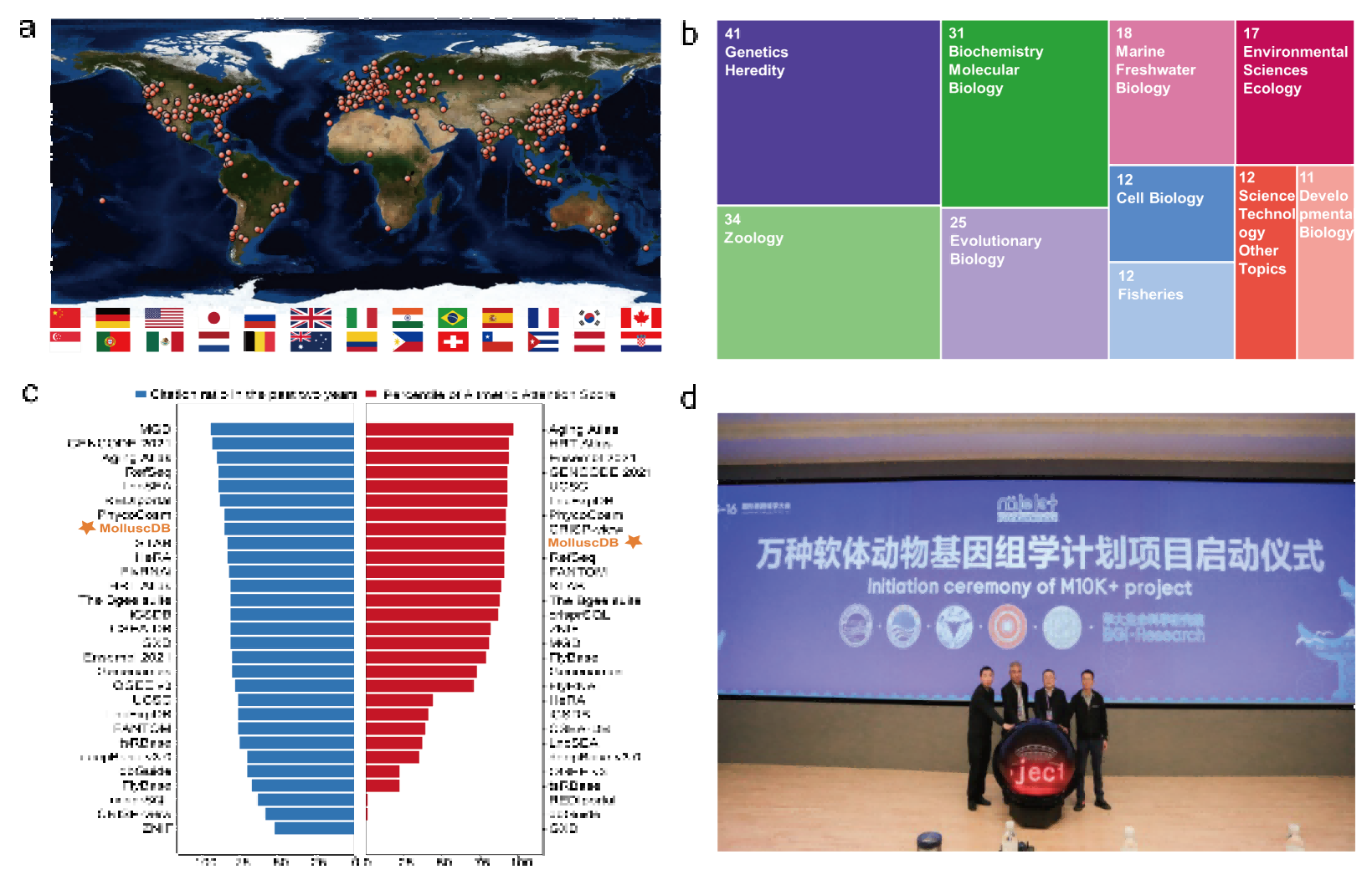 圖1-MolluscDB數據庫國際影響力(a: 訪(fǎng)問(wèn)國家;b: 引文領(lǐng)域;c: 數據庫排名;d: 國際M10K計劃啟動(dòng))