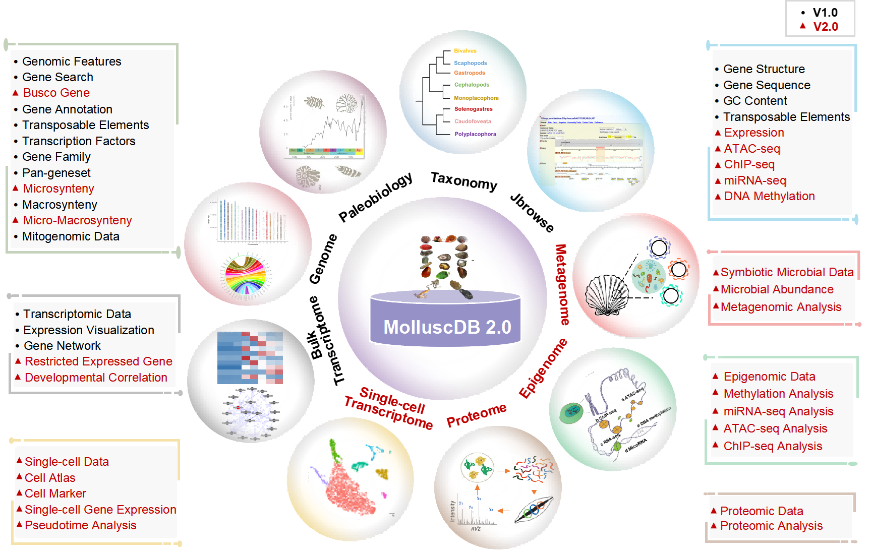 圖3-MolluscDB 2.0數據庫架構和多組學(xué)功能模塊概覽