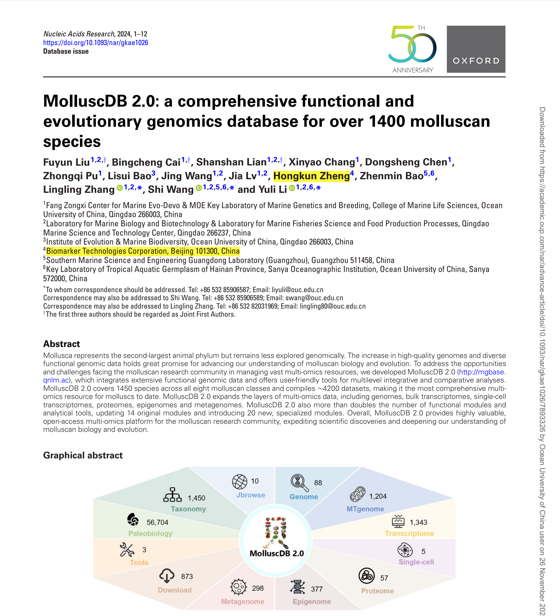 中國海洋大學(xué)“海洋生物遺傳學(xué)與育種”教育部重點(diǎn)實(shí)驗室、方宗熙海洋生物進(jìn)化與發(fā)育中心包振民院士和王師教授團隊在國際生物信息數據庫領(lǐng)域頂刊Nucleic Acids Research在線(xiàn)發(fā)表了軟體動(dòng)物功能和進(jìn)化基因組學(xué)綜合數據庫“MolluscDB 2.0: a comprehensive functional and evolutionary genomics database for over 1400 molluscan species”(MolluscDB 2.0:面向超過(guò)1400個(gè)軟體動(dòng)物種類(lèi)的功能和進(jìn)化基因組學(xué)綜合數據庫)。