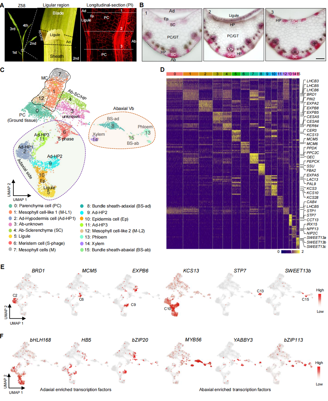 葉片角度(Leaf Angle, LA)是影響玉米種植密度和產(chǎn)量的關(guān)鍵因素。然而,調控葉片角度形成的機制尚不清楚。該研究通過(guò)對不同玉米自交系的莖葉枕區域進(jìn)行比較組織學(xué)分析,發(fā)現葉片角度大小顯著(zhù)受到莖葉枕上表皮韌皮纖維細胞(SC)的初始伸長(cháng)和隨后的木質(zhì)化的影響。通過(guò)批量和單細胞核RNA測序,生成了莖葉枕區域的全面轉錄組圖譜,并鑒定了許多可能影響其特化為SC的下皮細胞富集基因。