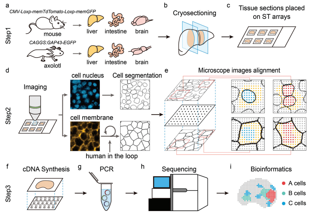 該研究提出了一種新的細胞邊界定義方法:利用基因編碼的熒光蛋白對細胞膜進(jìn)行標記,從而能夠在組織切片上精確定位細胞內的測序位點(diǎn)和轉錄本。與基于細胞核的方法相比,這種基于細胞膜的方法顯著(zhù)增加了捕獲的基因數量,小鼠和墨西哥鈍口螈肝臟中基因數量分別增加了67%和119%。