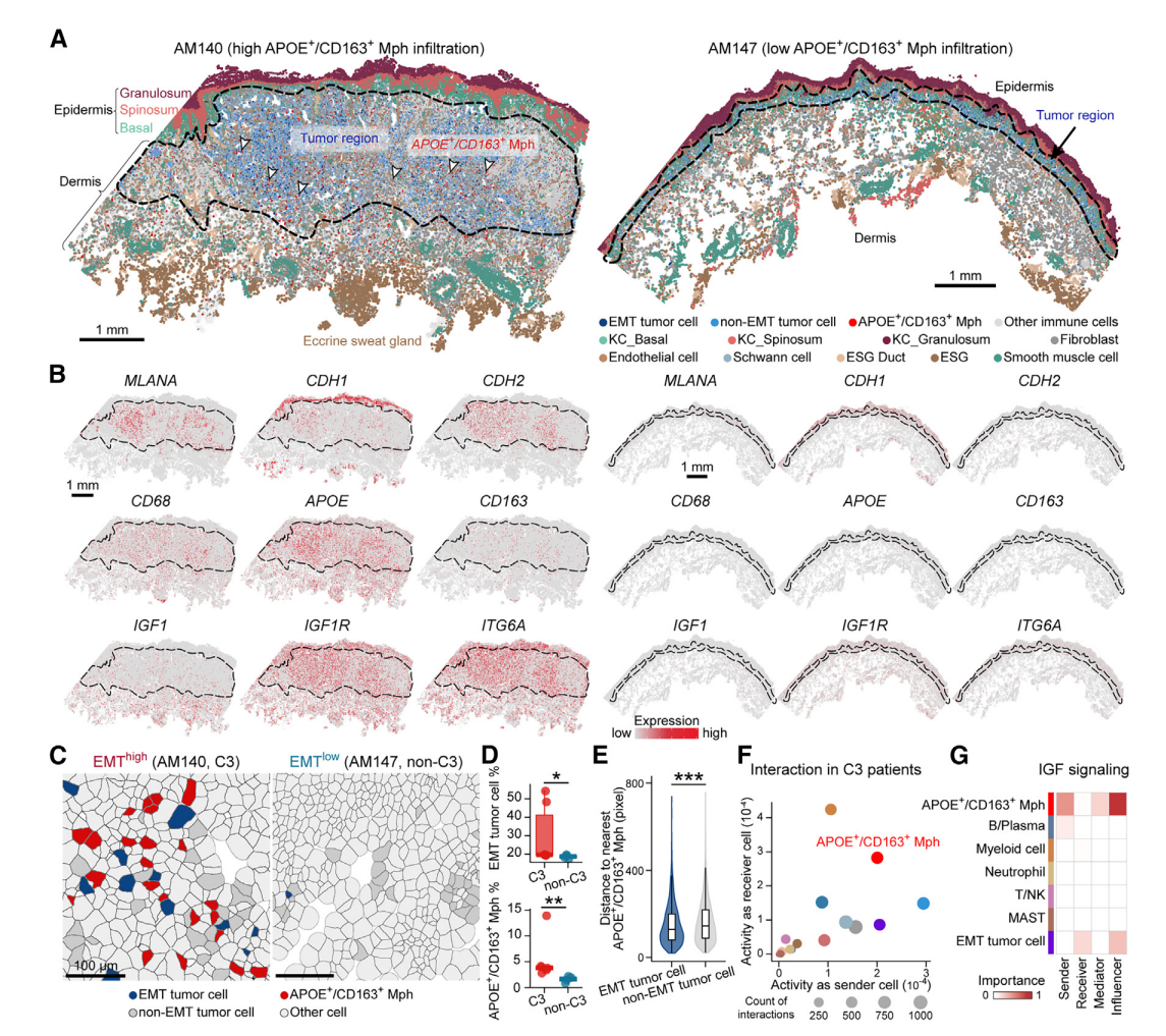 為在空間水平探究 APOE+CD163+ 巨噬細胞亞群與 EMT 腫瘤細胞的互相作用,研究人員利用百創(chuàng )S1000空間轉錄技術(shù)對10例 AM 樣本進(jìn)行了實(shí)驗(數據中能夠明確區分表皮的基底層、棘層、顆粒層以及汗腺和血管,腫瘤區域高表達黑色素基因MLANA、PMEL、TYPR?和 DCT)。