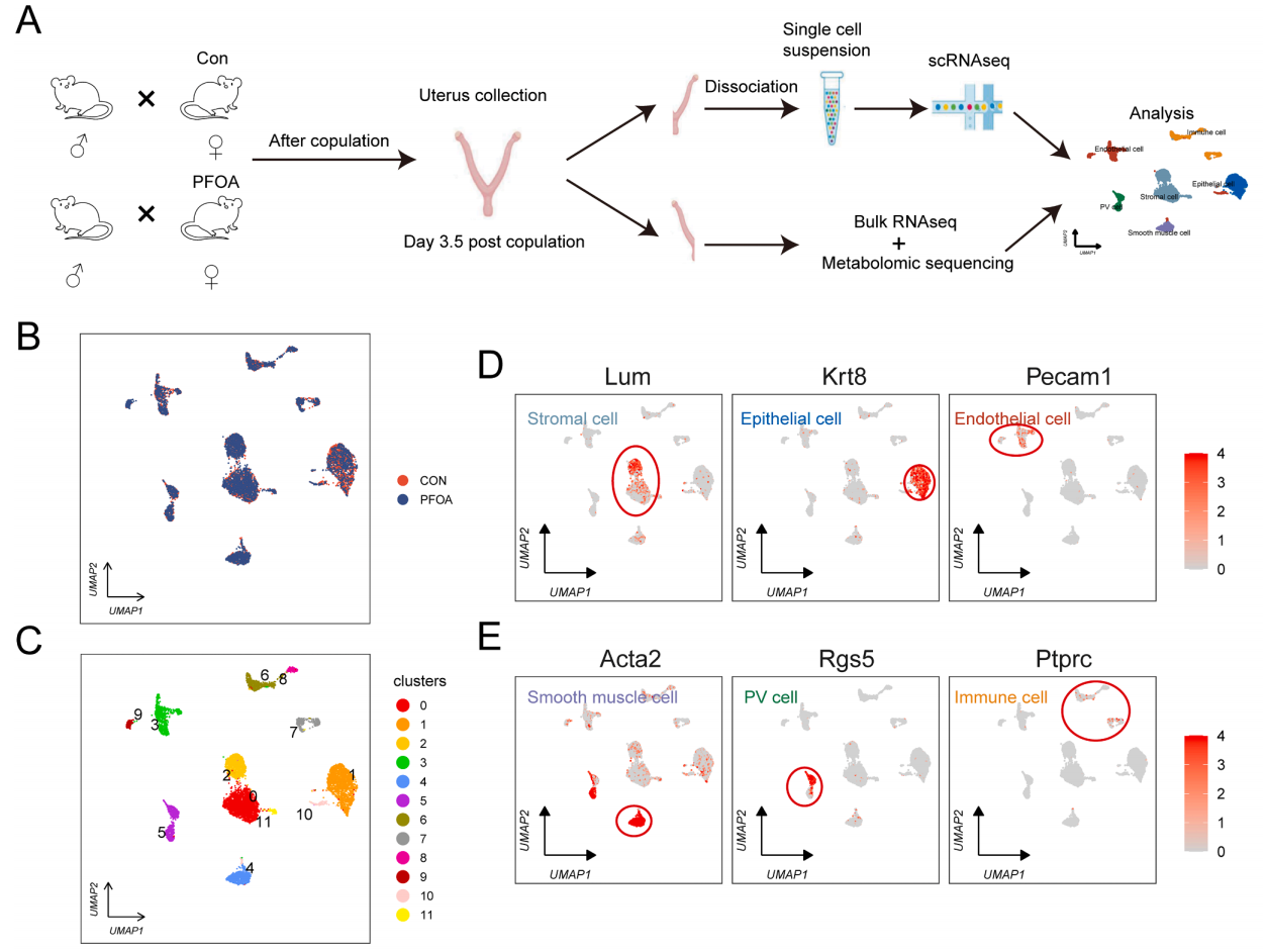 該研究通過(guò)小鼠模型,研究了低劑量PFOA暴露對子宮內膜容受性的影響。結果表明,PFOA暴露顯著(zhù)損害了子宮內膜容受性,導致胚胎著(zhù)床率顯著(zhù)下降。利用單細胞RNA測序技術(shù),研究者全面分析了PFOA破壞子宮內膜上皮細胞功能和發(fā)育的具體機制。值得注意的是,研究者發(fā)現ANGPTL(血管生成素樣)信號通路失調,這一通路對于子宮內膜基質(zhì)細胞和上皮細胞之間的通信至關(guān)重要,最終導致胚胎著(zhù)床失敗。這些發(fā)現為PFOA的生殖毒性提供了新的見(jiàn)解,并強調了針對環(huán)境污染物相關(guān)不孕癥治療干預的潛在靶點(diǎn)。