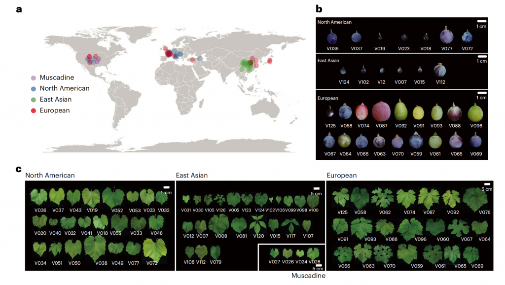 圖1-葡萄樣品全球地理分布及其果實(shí)和葉片形態(tài)