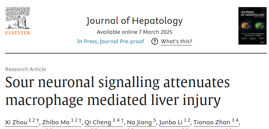2025年3月,華中科技大學(xué)同濟醫學(xué)院附屬同濟醫院器官移植研究所蘭培祥教授、陳知水教授和肝臟外科程琪教授研究團隊在Journal of Hepatology發(fā)表題為”Sour Neuronal Signalling Attenuates Macrophage Mediated Liver Injury”的研究論文。研究使用單細胞轉錄組測序技術(shù)等多種技術(shù),深入闡述人鼠中減輕肝缺血再灌注損傷的腦-肝軸調控通路,發(fā)現酸味刺激竟然可以通過(guò)神經(jīng)信號緩解肝臟損傷!這一發(fā)現不僅為肝臟疾病的治療提供了新思路,還從現代科學(xué)的角度驗證了中醫“酸入肝”的理論。