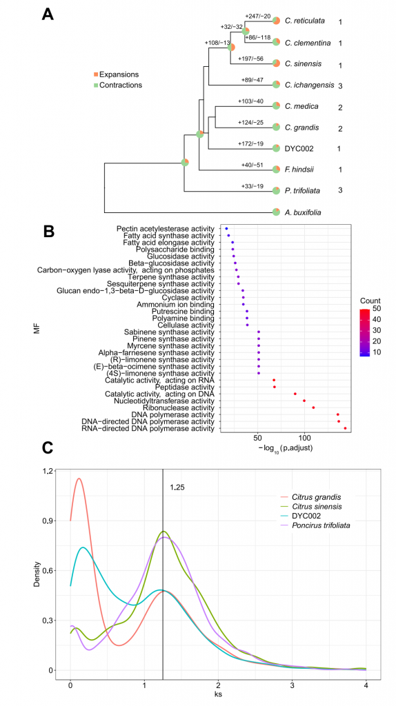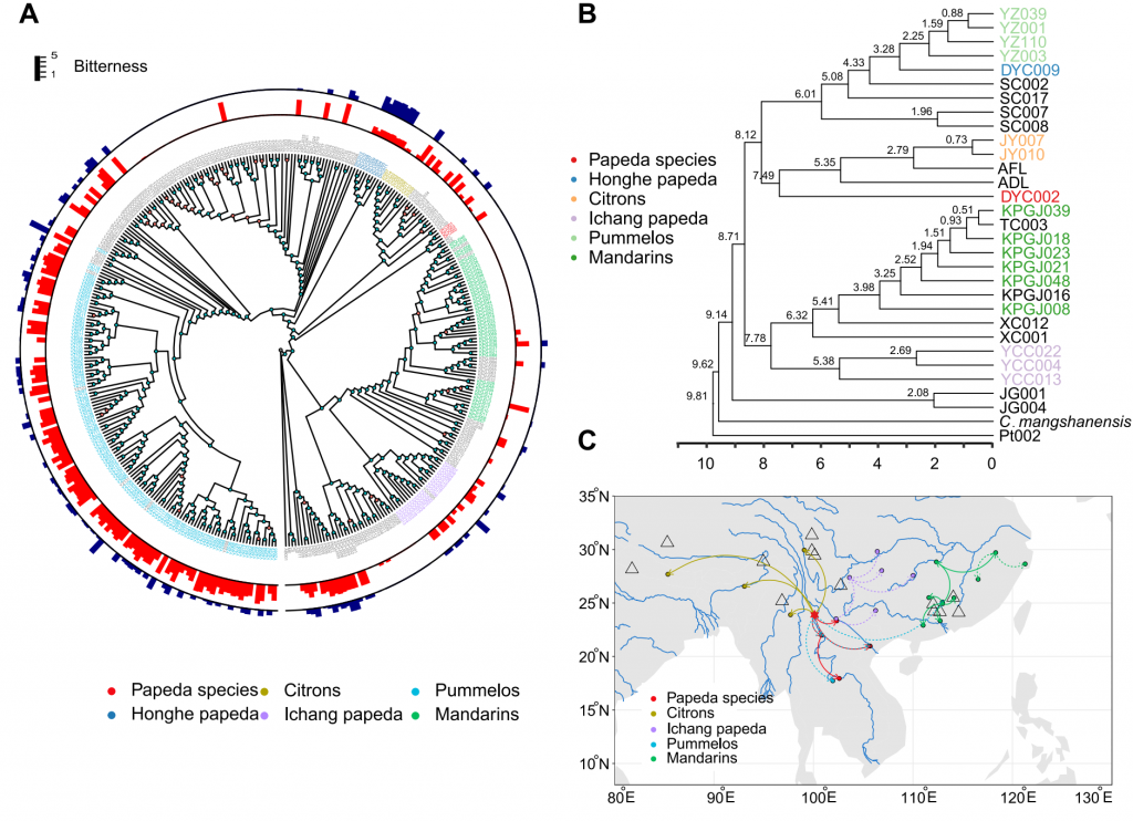 柑橘是世界上種植最廣泛的水果之一,目前在140多個(gè)國家和地區種植。雖然過(guò)去的二十年里柑橘植物的種群結構和遺傳多樣性已被調查,但由于其豐富的資源類(lèi)型和雜交頻繁,許多柑橘物種的起源和進(jìn)化仍不清楚。野生柑橘物種和原始柑橘保存了豐富的遺傳資源和遺傳多樣性,可用于闡明柑橘物種的起源和進(jìn)化。2015年,在西雙版納發(fā)現一棵200多年的野生柑橘樹(shù)大翼葉柑橘(DYC002),被認為是研究柑橘進(jìn)化及苦味馴化的很好材料。