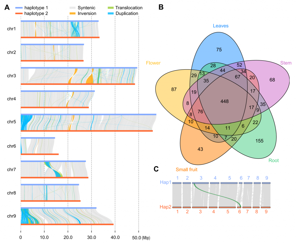 利用CCS數據和HIC數據,作者組裝出DYC002的兩套單倍型基因組,長(cháng)度分別為294和300 Mbp,注釋的基因數量分別為28000和27785個(gè);BUSCO完整度分別為97.39%和97.33%。通過(guò)比較分析,兩單倍型基因組間存在175萬(wàn)個(gè)SNPs,303,686個(gè)Indels,轉錄組分析表明,兩個(gè)單倍型中等位基因的表達高度一致。葉片中等位基因特異性表達基因(ASEGs)數量最高,而花中數量最低。在單倍型1和單倍型2的組裝中分別發(fā)現了535個(gè)和499個(gè)單倍型特異性基因。