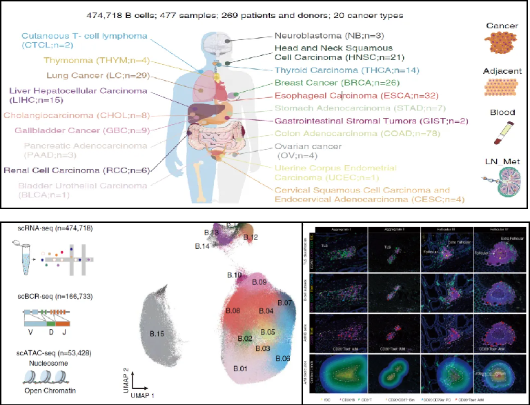 2024年,復旦大學(xué)附屬中山醫院樊嘉院士和高強教授、中國科學(xué)院上海免疫與感染研究所張曉明研究員、浙江大學(xué)基礎醫學(xué)院郭國驥教授合作在Science上發(fā)表了題為A blueprint for tumor-infiltrating B cells across human cancers的研究論文,結合單細胞轉錄組、 B細胞受體免疫組庫和表觀(guān)基因組的多組學(xué)數據,系統性地刻畫(huà)了腫瘤浸潤性B細胞的異質(zhì)性、動(dòng)態(tài)分化和表觀(guān)調控機制。創(chuàng )新地揭示了腫瘤微環(huán)境中廣泛存在的EF應答的癌種偏好性、空間定位特征、臨床意義及潛在的誘導調控機制。