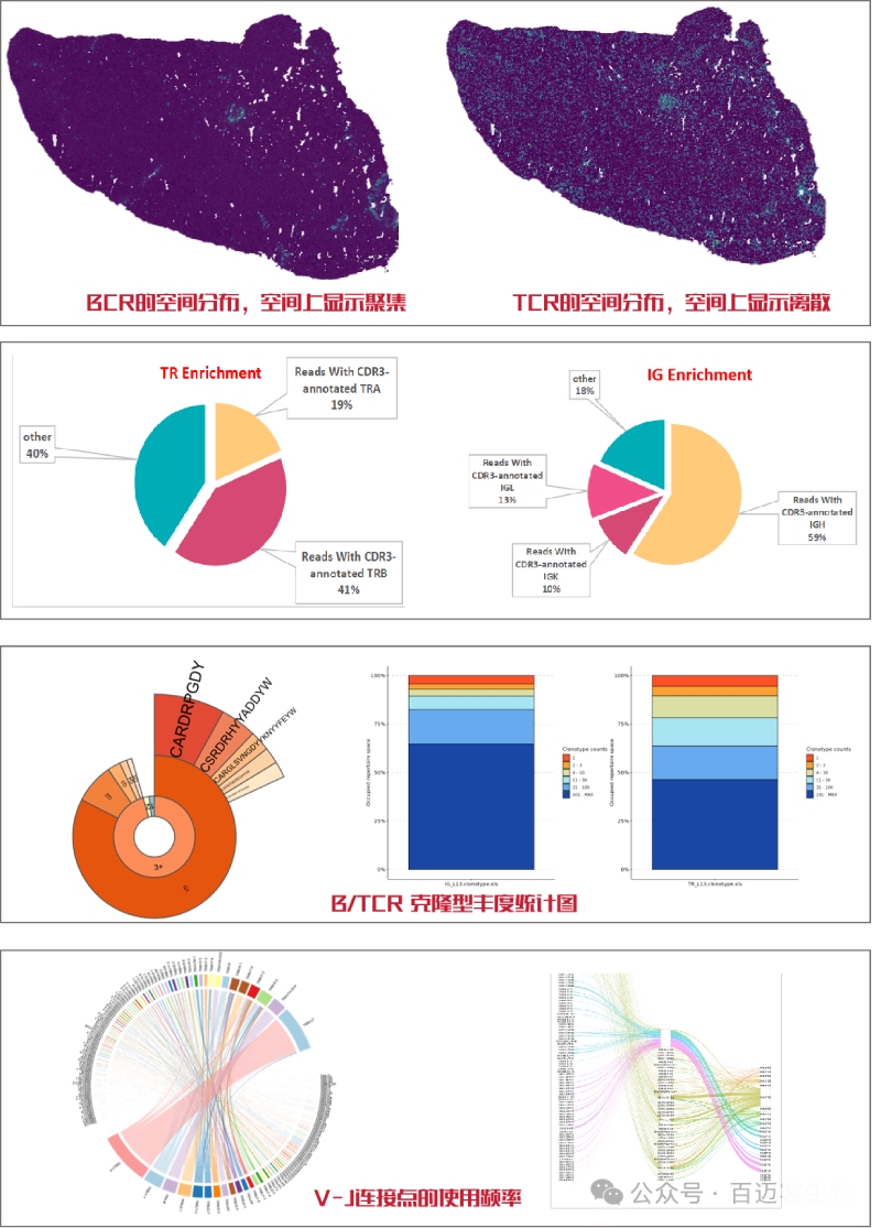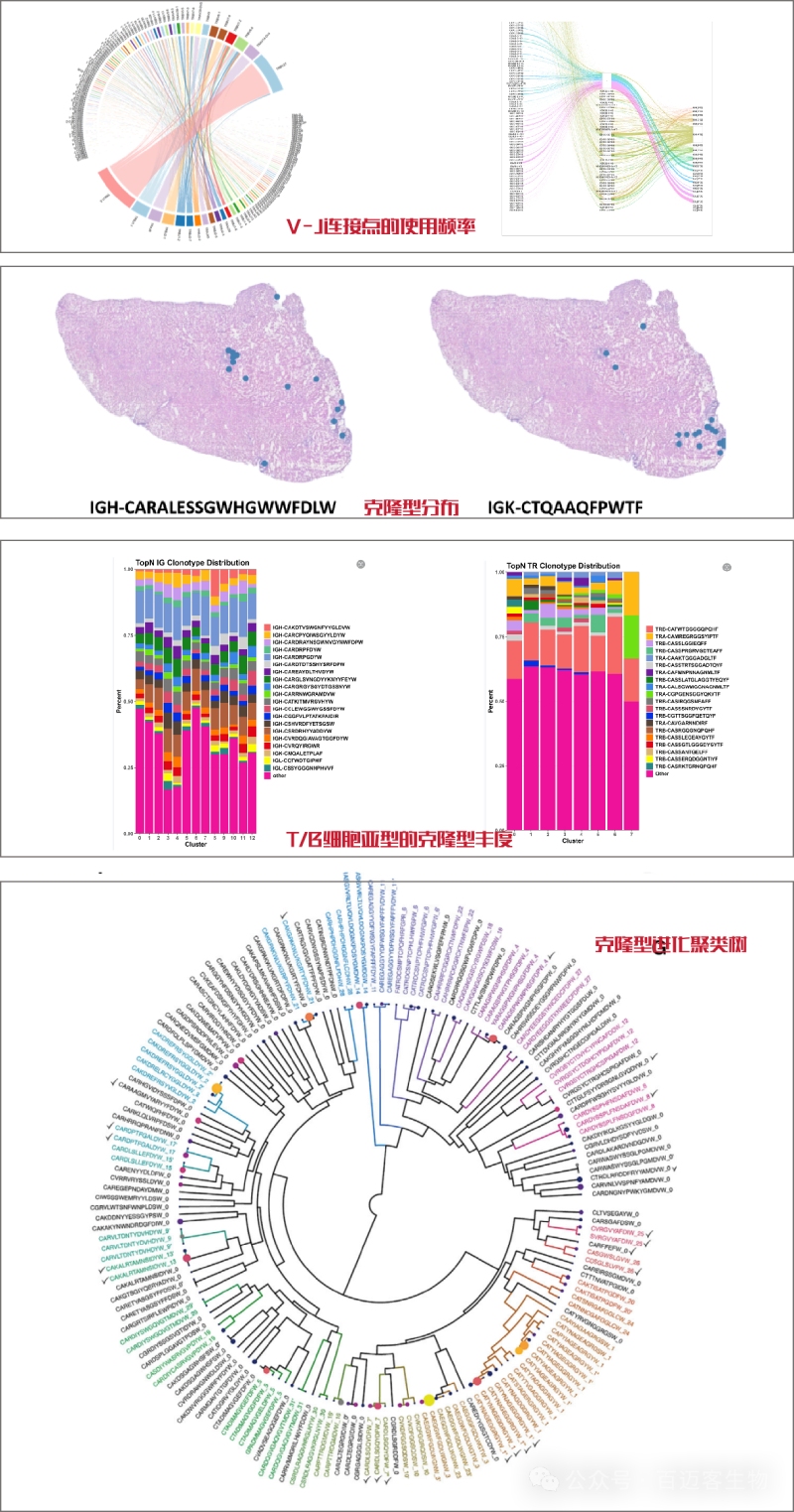 腫瘤樣本我們可以類(lèi)比為一處具有復雜地貌的特殊地理環(huán)境,不同的環(huán)境造就了各種細胞的不同狀態(tài),而T/B細胞在不同的“選擇壓力”下邊進(jìn)行了不同的“適應性進(jìn)化”。對不同生態(tài)位的T/B細胞尤其是TCR/BCR進(jìn)行測定,有助于我們去揭示免疫細胞的克隆起源和進(jìn)化過(guò)程。例如,通過(guò)分析TCR的VDJ重排,可以追蹤T細胞克隆的起源和擴增過(guò)程。這種分析有助于理解免疫細胞在不同生理和病理狀態(tài)下的動(dòng)態(tài)變化。