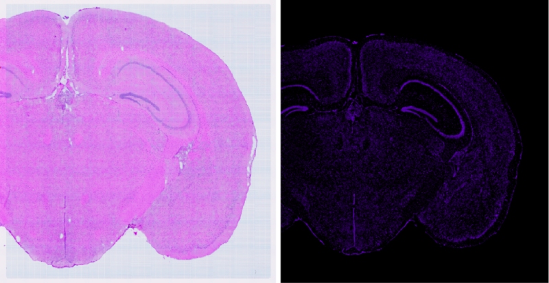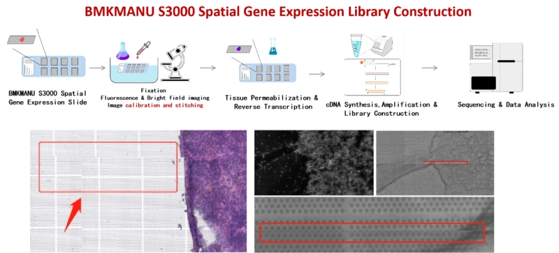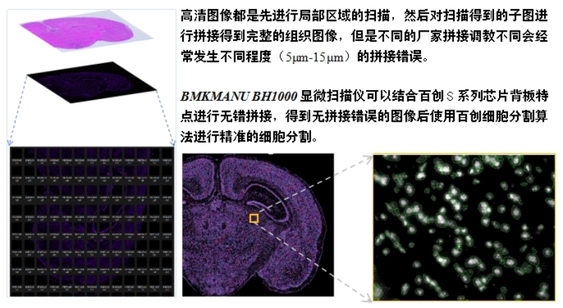 可以利用BH1000對明場(chǎng)及熒光掃描過(guò)程中經(jīng)常出現的拼接錯誤進(jìn)行校準(自主研發(fā)BMCHiper軟件,搭配自研半透半返模塊,實(shí)現圖像無(wú)錯校準),得到原片無(wú)錯高清的熒光圖像與原片無(wú)錯高清的明場(chǎng)圖像,為后續空間數據準確的定位和可視化提供基礎,使得復雜的轉錄組數據能夠轉化為最直觀(guān),最精準的生物學(xué)見(jiàn)解。
