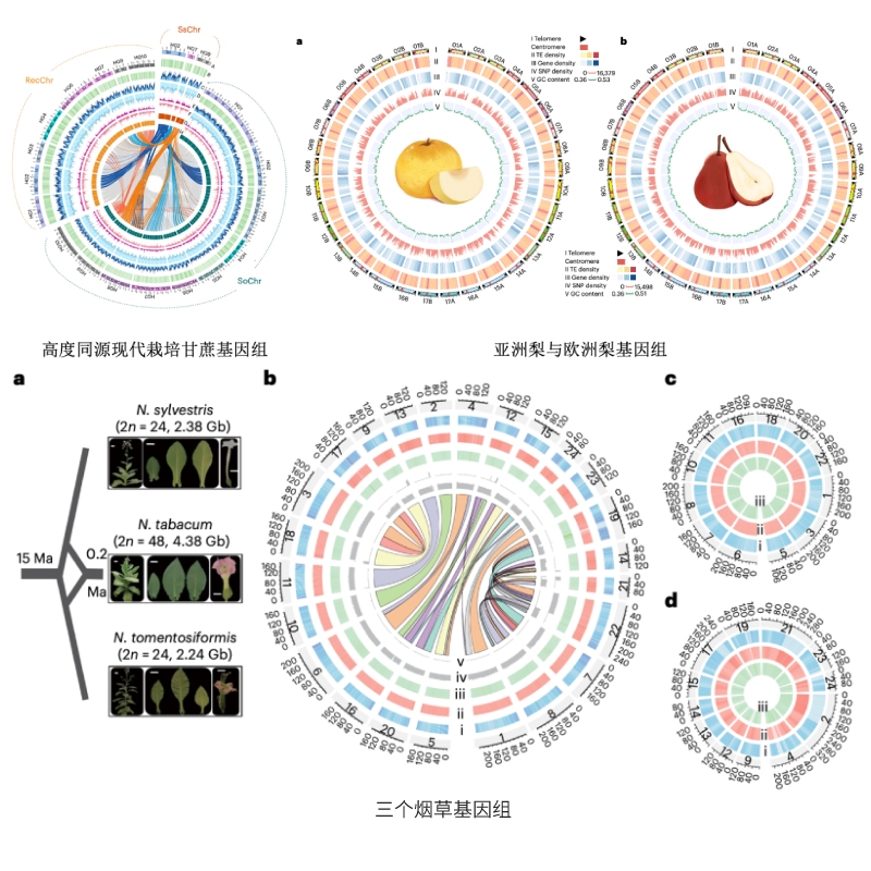 高質(zhì)量參考基因組是植物多組學(xué)研究的基石,其完整性、準確性直接決定了重測序比對、轉錄組定量、代謝組關(guān)聯(lián)分析等下游研究的可靠性。盡管當前植物基因組測序與組裝技術(shù)飛速發(fā)展,單仍存在某些亞種、品種、野生近緣種的基因組空缺。2025年相關(guān)研究成果顯著(zhù):1月3日,廣西大學(xué)亞熱帶農業(yè)生物資源保護與利用國家重點(diǎn)實(shí)驗室張積森團隊解析了現代栽培甘蔗的復雜基因組,結合群體測序挖掘甘蔗糖份相關(guān)位點(diǎn);3月,通過(guò)3個(gè)煙草基因組+5,196份簡(jiǎn)化基因組測序,揭示重要模式植物基因組進(jìn)化與復雜性狀調控機制;8月,完成亞洲梨與歐洲梨高質(zhì)量基因組組裝,結合362份不同種質(zhì)重測序數據,揭示亞洲梨和歐洲梨的演化歷史,開(kāi)展果實(shí)品質(zhì)相關(guān)SV-GWAS研究;11月,通過(guò)甜玉米基因組組裝,結合轉錄組、代謝組和功能驗證的系統整合分析,全面揭示了甜玉米風(fēng)味形成的遺傳與分子機制。