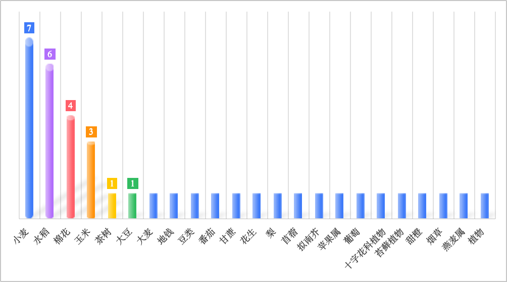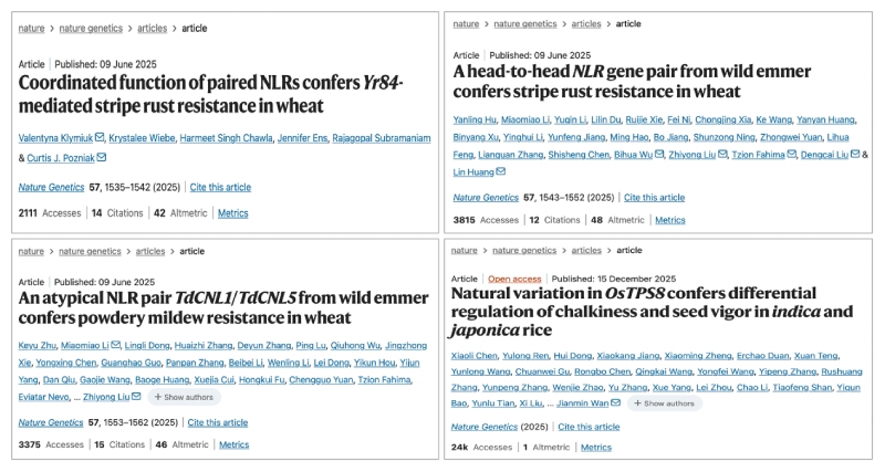 從物種分布來(lái)看,2025年度Nature?Genetics上發(fā)表的植物文章中,小麥占比最高,年發(fā)文量7篇。其中,2025年6月9日,該期刊同時(shí)在線(xiàn)發(fā)表三篇小麥抗病領(lǐng)域的重磅研究論文;其次依次為水稻(6篇)、棉花(4篇)、玉米(3篇)等物種。這一現象也印證了作物研究在全球植物科學(xué)與農業(yè)生物育種中的核心地位。