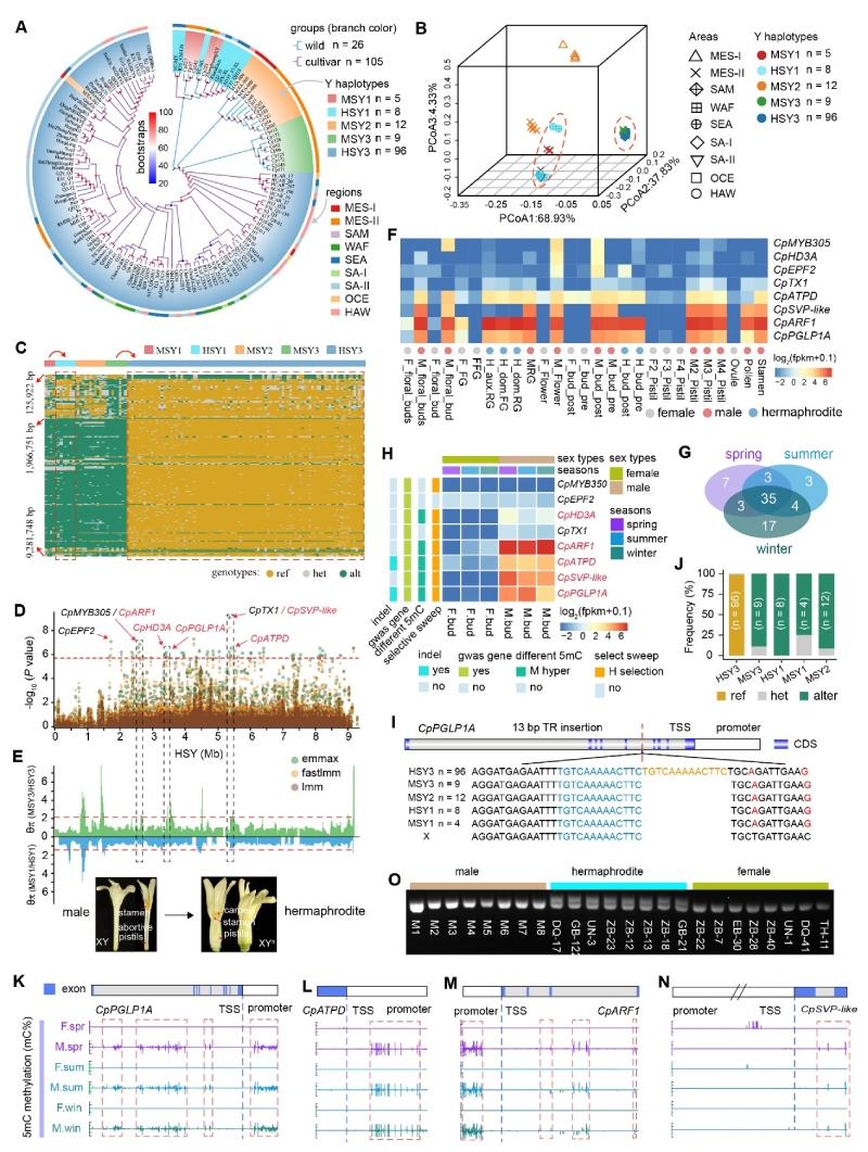 這種性別轉換是由針對雄性偏好基因的選擇驅動(dòng)的,并在Yh連鎖區域中定位了一個(gè)與性別轉換密切相關(guān)13?bp串聯(lián)重復結構變異(HSY3-TR-13bp)。該兩性株特異性變異位于雄性偏好基因CpPGLP1A中,且被HSY3群體選擇固定(圖3)。