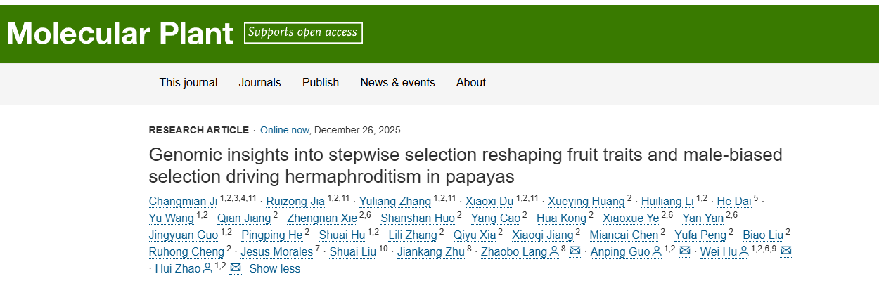 2025年12月23日,中國熱科院生物所、熱帶作物生物育種全國重點(diǎn)實(shí)驗室聯(lián)合南方科技大學(xué)、中科院分子植物科學(xué)卓越創(chuàng )新中心、中國科學(xué)院大學(xué)、熱科院椰子所、Nature?Source?Improved?Plants,?Mexico和百邁客生物等國內外科研單位在中科院1區Top期刊Molecular?Plant(影響因子:24.1)發(fā)表了題為“Genomic?insights?into?stepwise?selection?reshaping?fruit?traits?and?male-biased?selection?driving?hermaphroditism?in?papayas”的最新研究論文,其中百邁客生物生信工程師戴鶴為該論文共同作者。