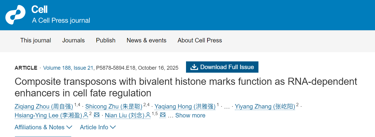近日,清華大學(xué)生命科學(xué)學(xué)院、清華-北大生命科學(xué)聯(lián)合中心劉念課題組聯(lián)合北京大學(xué)生命科學(xué)學(xué)院、北大-清華生命科學(xué)聯(lián)合中心李湘盈課題組在《細胞》(Cell)雜志上在線(xiàn)發(fā)表了題為“攜帶二價(jià)組蛋白修飾的復合型轉座子作為RNA依賴(lài)性增強子調控細胞命運”(Composite transposons with bivalent histone marks function as enhancers in cell fate regulation)的研究論文。