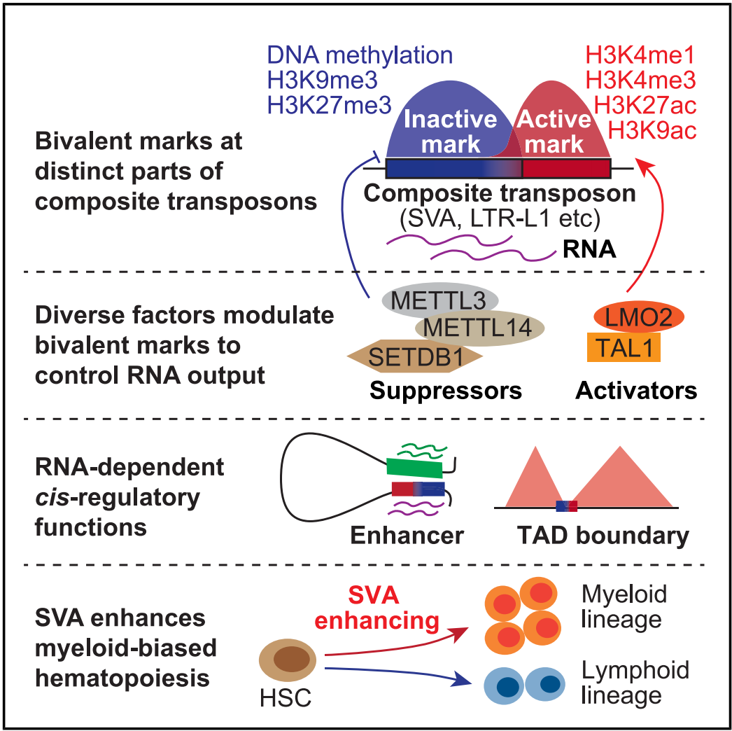 圖8. SVA通過(guò)雙重染色質(zhì)標記和RNA依賴(lài)性增強子功能調控細胞命運的工作模型
