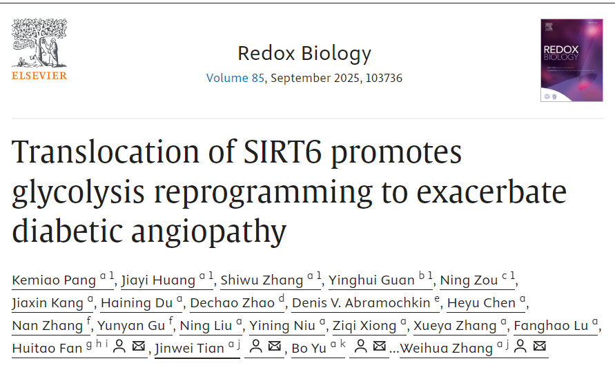 哈爾濱醫科大學(xué)張偉華教授和李水潔教授、哈爾濱醫科大學(xué)附屬第二醫院于波教授和田進(jìn)偉教授以及哈爾濱醫科大學(xué)附屬第一醫院范會(huì )濤教授在Redox Biology上發(fā)表題為“Translocation of SIRT6 promotes glycolysis reprogramming to exacerbate diabetic angiopathy”的研究論文。