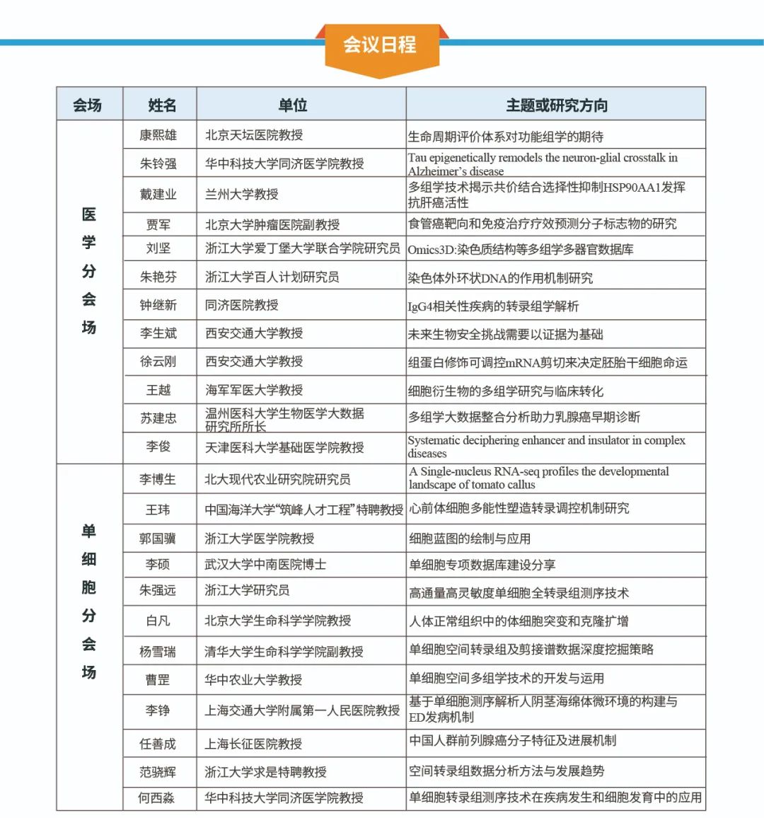 22日報道,23日主會(huì )場(chǎng),24日五個(gè)分會(huì )場(chǎng)(植物功能基因組學(xué)研究會(huì )場(chǎng)、動(dòng)物多組學(xué)應用研究會(huì )場(chǎng)、微生物質(zhì)譜多組學(xué)研究會(huì )場(chǎng)、醫學(xué)多組學(xué)精準診療應用研究會(huì )場(chǎng)、時(shí)空多組學(xué)技術(shù)發(fā)展及應用會(huì )場(chǎng))并行,25-27日為期刊講座及培訓課程。