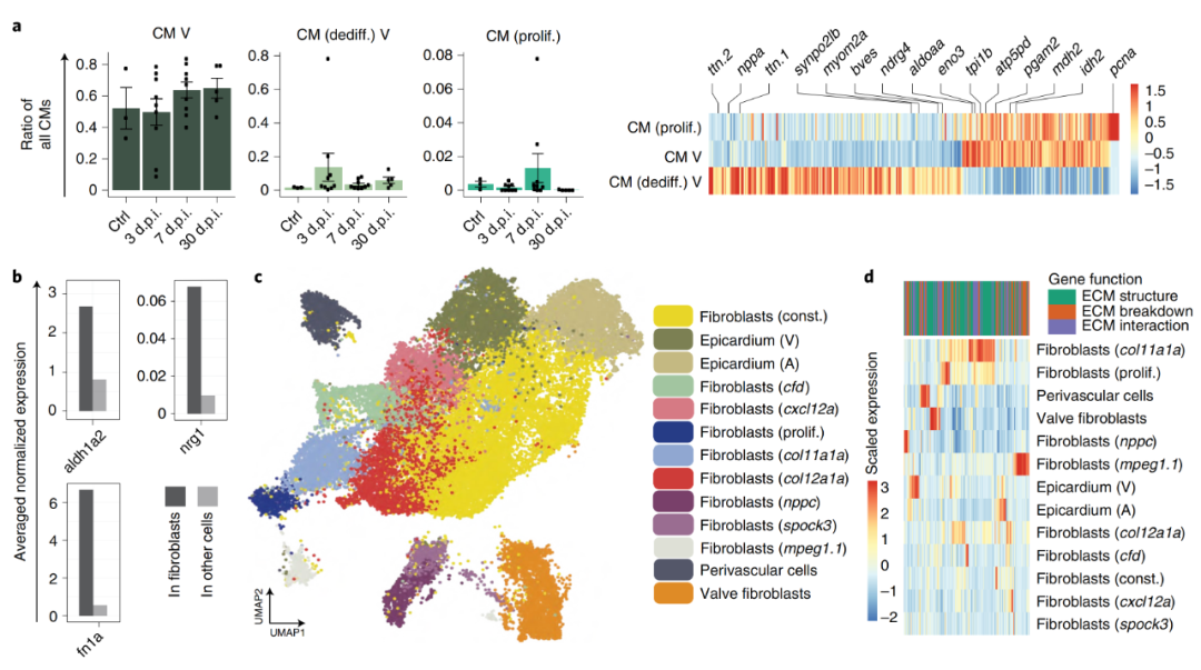 作者首先評估了健康和再生心臟中的細胞類(lèi)型多樣性,單細胞轉錄組的聚類(lèi)分析顯示了所有主要的心臟細胞類(lèi)型。正如預期的那樣,觀(guān)察到成纖維細胞和免疫細胞在損傷后強烈增加(圖1b)。進(jìn)一步檢查聚類(lèi)數據發(fā)現,心臟的三個(gè)主要層:心外膜、心肌和心內膜的細胞類(lèi)型之間存在一個(gè)亞結構。作者假設,由于心房和心室中這些細胞類(lèi)型的功能差別,這種細胞類(lèi)型的亞結構可能存在空間差異。于是使用Tomo-seq方法(一種用冷凍切片機沿感興趣的軸對組織進(jìn)行切片,然后在每個(gè)切片上進(jìn)行RNA-seq的技術(shù))進(jìn)行空間分辨率轉錄組,并將空間數據解卷積為單細胞轉錄譜,可以驗證一些細胞亞型在心房和心室富集(圖1c)。之后再通過(guò)物理分離心房和心室,使用scRNA-seq證實(shí)了這一發(fā)現(圖1d)。