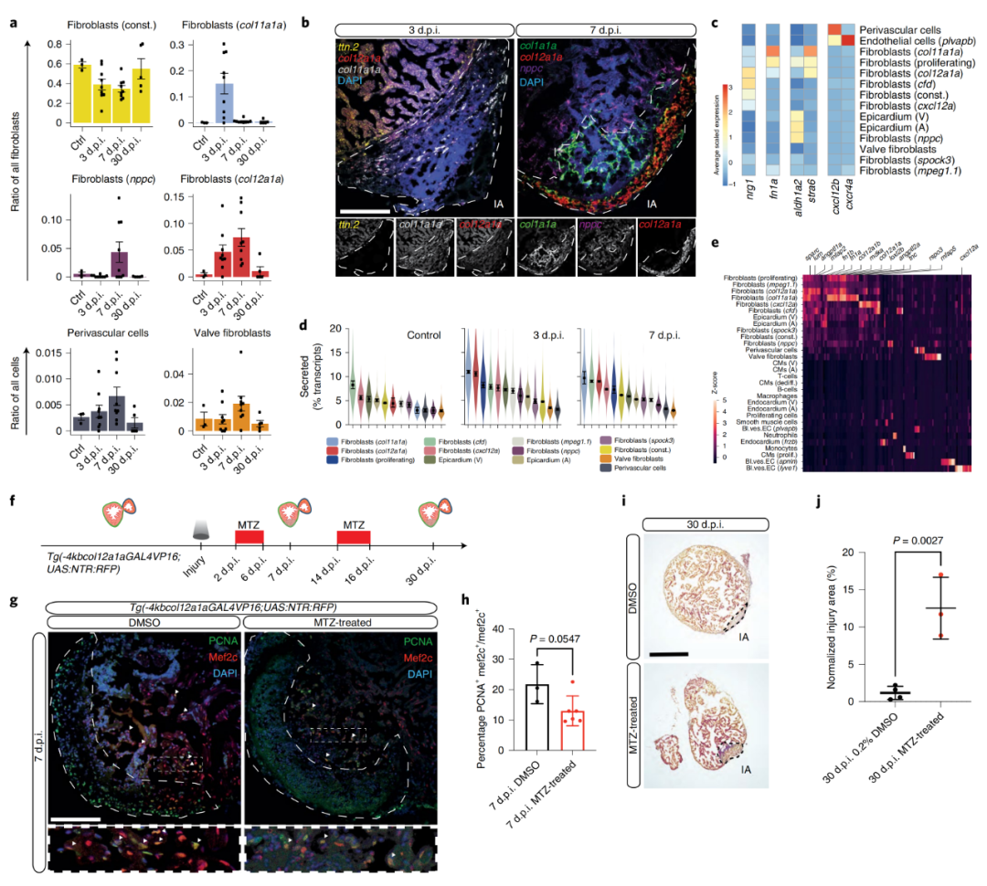 雖然作者對單細胞基因表達譜的時(shí)空分析強烈表明了瞬時(shí)成纖維細胞的再生功能,但還需要額外的實(shí)驗來(lái)驗證這一假設。為了從功能上評估瞬時(shí)col11a1a和col12a1a成纖維細胞的作用,作者使用硝基還原酶/甲硝唑(NTR/MTZ)系統進(jìn)行靶向細胞剔除。在MTZ處理后的轉基因系Tg(-4kbcol12a1a:GAL4VP16;UAS:NTR:RFP)中,在7 d.p.i.時(shí)相較于對照,5 / 6的心臟顯示心肌細胞增殖減少,col12aa表達細胞減少(圖3g,h)。在30d.p.i.時(shí),col12a1+細胞剔除顯著(zhù)損害心臟再生(圖3i,j)??傊?,作者確定了心臟再生過(guò)程中具有潛在再生作用的三種成纖維細胞狀態(tài):col11a1a、col12a1a和nppc成纖維細胞?;蚣毎蕹龜祿娏冶砻?em>col12a1a表達細胞在再生生態(tài)位中發(fā)揮了作用。