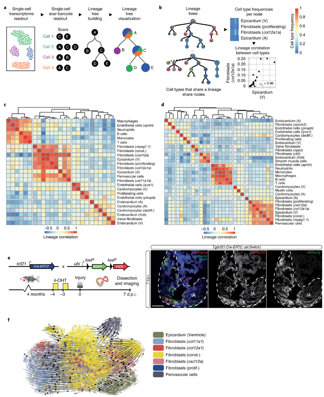 為了系統地識別健康和再生斑馬魚(yú)心臟中的細胞類(lèi)型,作者對損傷前后不同階段的大約20萬(wàn)個(gè)解離細胞進(jìn)行了scRNA-seq(圖1a)。為了準確得到細胞發(fā)育起源的相關(guān)信息,作者還應用了一種基于CRISPR–Cas9技術(shù)的大規模平行譜系追蹤方法,通過(guò)注射Cas9和針對多拷貝轉基因(斑馬魚(yú)系中的dTomato:一種用于斑馬魚(yú)細胞追蹤和譜系分析的多光譜細胞標記)的sgRNA,創(chuàng )建了作為譜系條形碼的“遺傳疤痕”來(lái)記錄早期發(fā)育中的譜系關(guān)系。