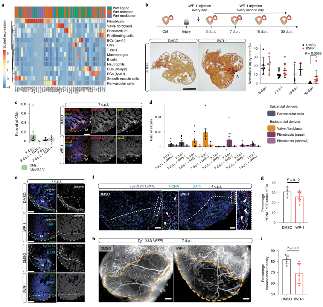 為了評估血管再生,作者對4d.p.i.下冠脈內皮細胞(cECs)的增殖以及7 d.p.i.損傷區冠狀動(dòng)脈的覆蓋范圍進(jìn)行了定量分析。發(fā)現注射IWR-1后,cEC增殖在4 d.p.i.時(shí)有邊緣但不顯著(zhù)的下降(圖6f,g)。然而,在7d.p.i.時(shí),損傷區冠狀動(dòng)脈覆蓋明顯減少(圖6h,j)。這些結果表明,Wnt抑制后觀(guān)察到的心臟再生減少至少部分是由血管再生缺陷介導的。這種缺陷似乎不是由cECs增殖減少引起的,而可能與血管再生的其他方面有關(guān)。