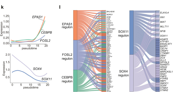 2、利用細胞軌跡分析和轉錄調控網(wǎng)絡(luò )分析預測到由特定TF調節的PN到MES細胞狀態(tài)轉換;