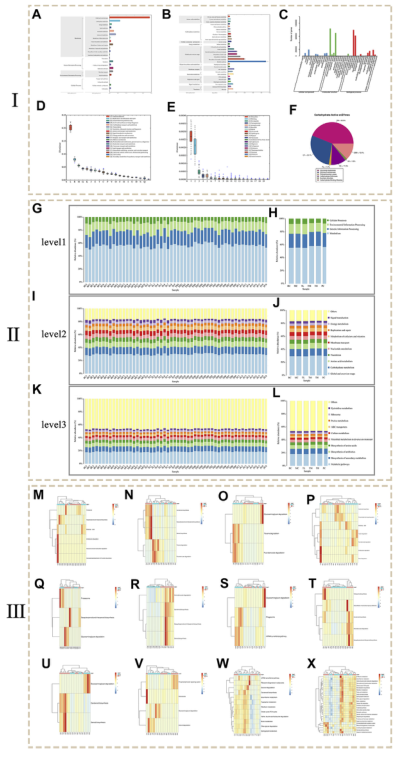 圖5.宏基因組測序結果。 (Ⅰ:功能注釋分析。Ⅱ:KEGG通路組成和豐度直方圖。Ⅲ:metagenomeSeq差異通路豐度熱圖)。