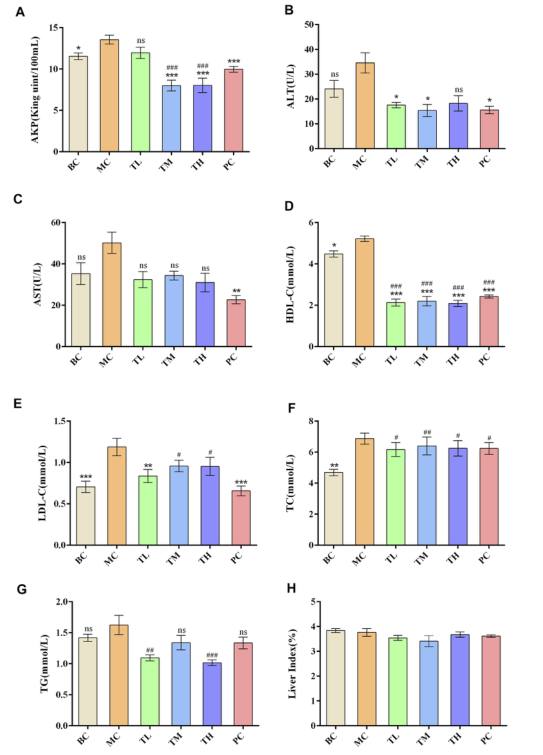 TM組和TH組降低AKP效果優(yōu)于TL組,TG組降低AKP效果優(yōu)于TM組。PC組降低AKP的效果優(yōu)于TL組,但差于TM組和TH組。PC組降低低密度脂蛋白膽固醇的效果優(yōu)于TM組和TH組,表明高脂飼料可導致大鼠血脂和肝酶代謝異常,高脂高脂顆??筛纳聘咧笫笱x和肝酶活性。與陽(yáng)性藥物相比,HRG在改善高密度脂蛋白膽固醇、甘油三酯、堿性磷酸酶方面具有優(yōu)勢,且改善程度可能呈劑量依賴(lài)性。各組間器官指數無(wú)顯著(zhù)差異,HRG對小鼠生化指標和器官指數的影響如圖2所示。