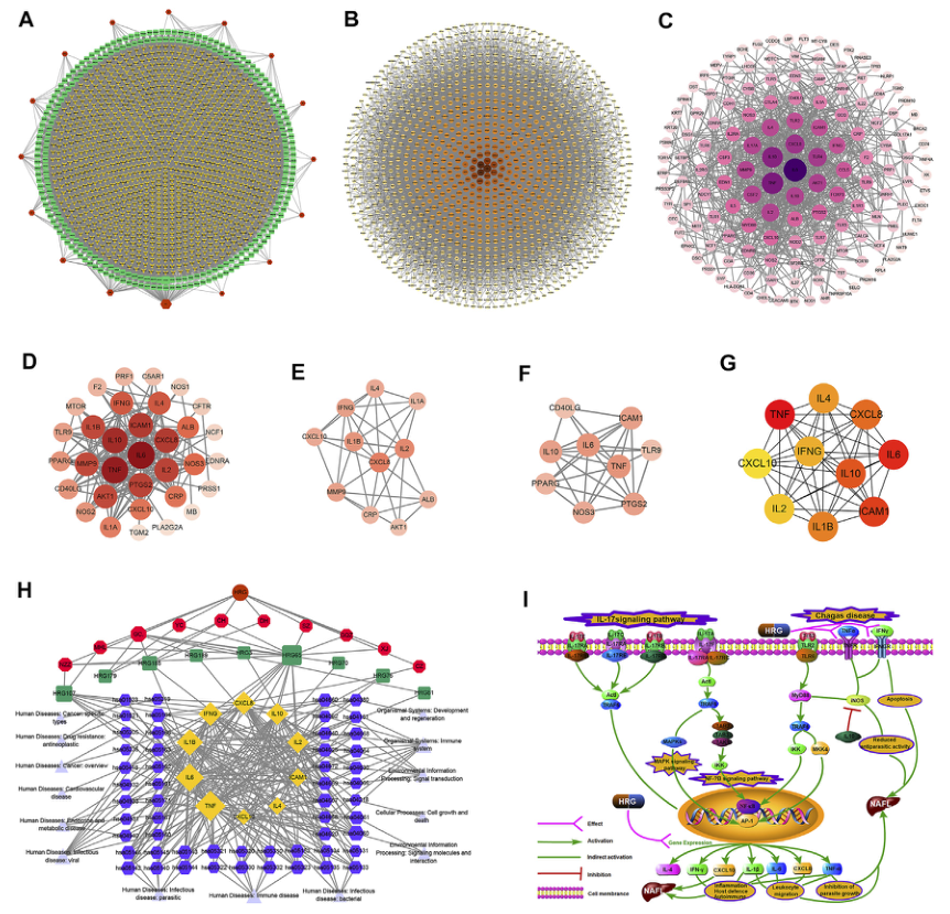 (A)HRG藥材靶點(diǎn)網(wǎng)絡(luò )。(B)與NAFL有關(guān)的PPI網(wǎng)絡(luò )。(C)與IFD有關(guān)的PPI網(wǎng)絡(luò )。(D)HRG-IFD-NAFL合并目標的PPI網(wǎng)絡(luò )。(E)模塊1(F)模塊2(G)Hub基因。(H)草藥-關(guān)鍵化合物-潛在靶向途徑網(wǎng)絡(luò )。(I)關(guān)鍵靶點(diǎn)可能導致的關(guān)鍵生物進(jìn)展圖例。