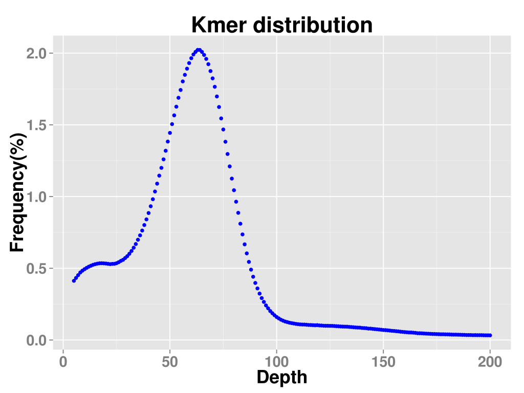 由于基因組存在雜合位點(diǎn)和重復序列,k-mer曲線(xiàn)往往不會(huì )呈現出良好的泊松分布,而是在主峰前后出現其他的峰,如果存在一定雜合度,會(huì )導致在主峰對應的橫坐標的二分之一處出現雜合峰,而一定的重復度則會(huì )在主峰對應的橫坐標的整數倍處出現重復峰。