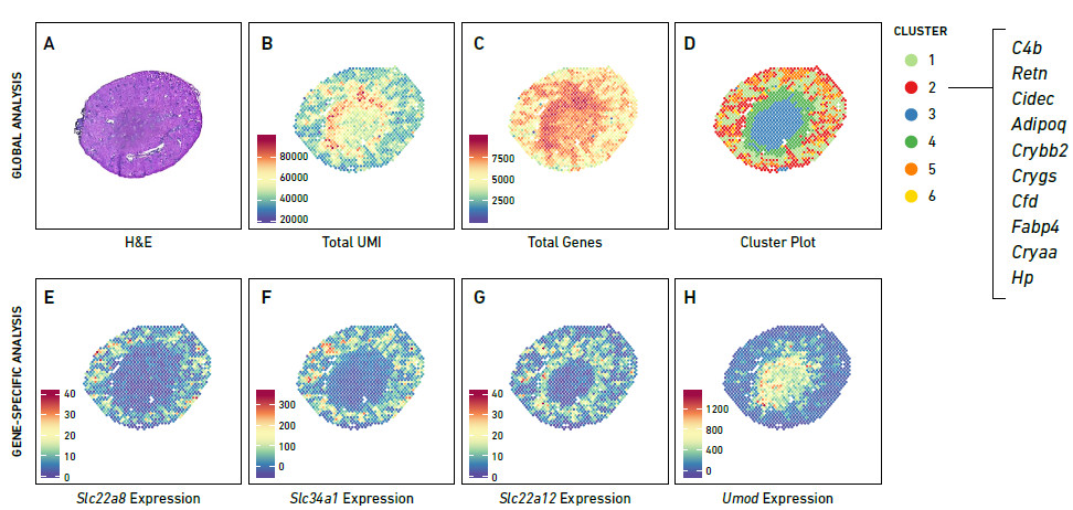 A代表組織切片的HE染色。B和C分別代表UMI計數和總基因計數與組織空間位置的圖像疊加。D代表基于總體差異表達基因的空間聚類(lèi)結果,最右邊顯示了cluster2排名前10的特異表達基因。E、F、G、H分別代表了不同基因的空間mRNA表達。
